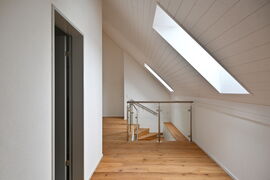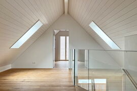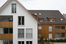 Die Kombination aus teilweise hinterlüfteter Holzfassade und Kompaktfassade erfüllt alle Anforderungen an eine nachhaltige und energieeffiziente Gebäudehülle. Die Kompaktfassade ist, abgesehen vom Sockelgeschoss des Hauses B, in schlichtem Weiß gehalten, was einen abstrakten und dennoch harmonischen Kontrast zwischen den beiden Fassadenstrukturen schafft. Die vertikale Ausrichtung der Holzverkleidung des Hauses A bildet eine Brücke zwischen moderner Architektur und dem gewachsenen Dorfkern.