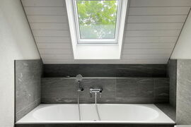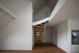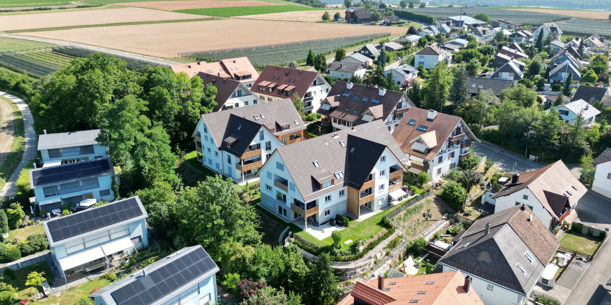 Die Gestaltung der Umgebung greift die Bepflanzung der umliegenden Grundstücke auf und setzt mit einheimischen Pflanzen Akzente, die schattenspendende Außenbereiche schaffen. Direkt an das Grundstück grenzt ein Bach, der zum Verweilen einlädt und hauptsächlich von den Bewohnerinnen und Bewohnern der beiden Mehrfamilienhäuser genutzt wird.