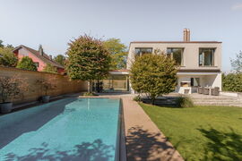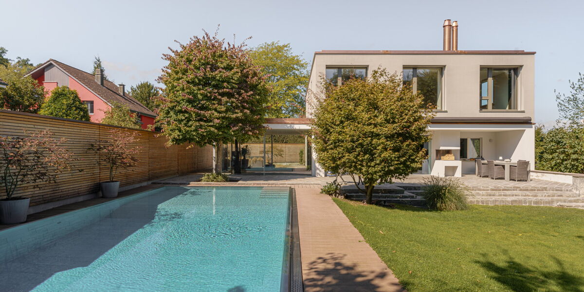 Die Bauherrin und der Bauherr streben eine umfassende Umgestaltung ihres Einfamilienhauses an. Die Idee eines reinen Holzbaus hat unser Interesse geweckt. Das bestehende Untergeschoss beherbergt Parkplätze, Technikräume und Stauraum, während sich im Erdgeschoss die Küche, das Esszimmer und das Wohnzimmer befinden. Vom Esszimmer aus gelangt man in den Garten mit dem langen Pool. Die Schlafzimmer sind im Dachgeschoss untergebracht.