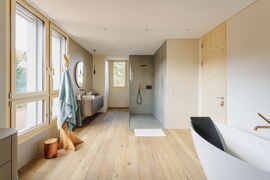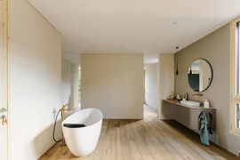 Im neuen Obergeschoss entsteht ein großzügiges Master-Schlafzimmer mit eigenem Ankleidebereich und einem Masterbad. Neben dem Masterzimmer befindet sich ein Gästezimmer inkl. En-Suite-Bad. Die überdurchschnittliche Raumhöhe von 2.6m im neuen Obergeschoss, ermöglicht das luftige und einladende Ambiente.