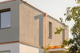 Die umliegenden Häuser prägen eine Dachlandschaft mit dunklen Farbtönen. Durch die Wahl eines ebenfalls dunklen Fassadentons für das neue Obergeschoss fügt sich das Gebäude elegant und selbstbewusst in dieses Umfeld ein.