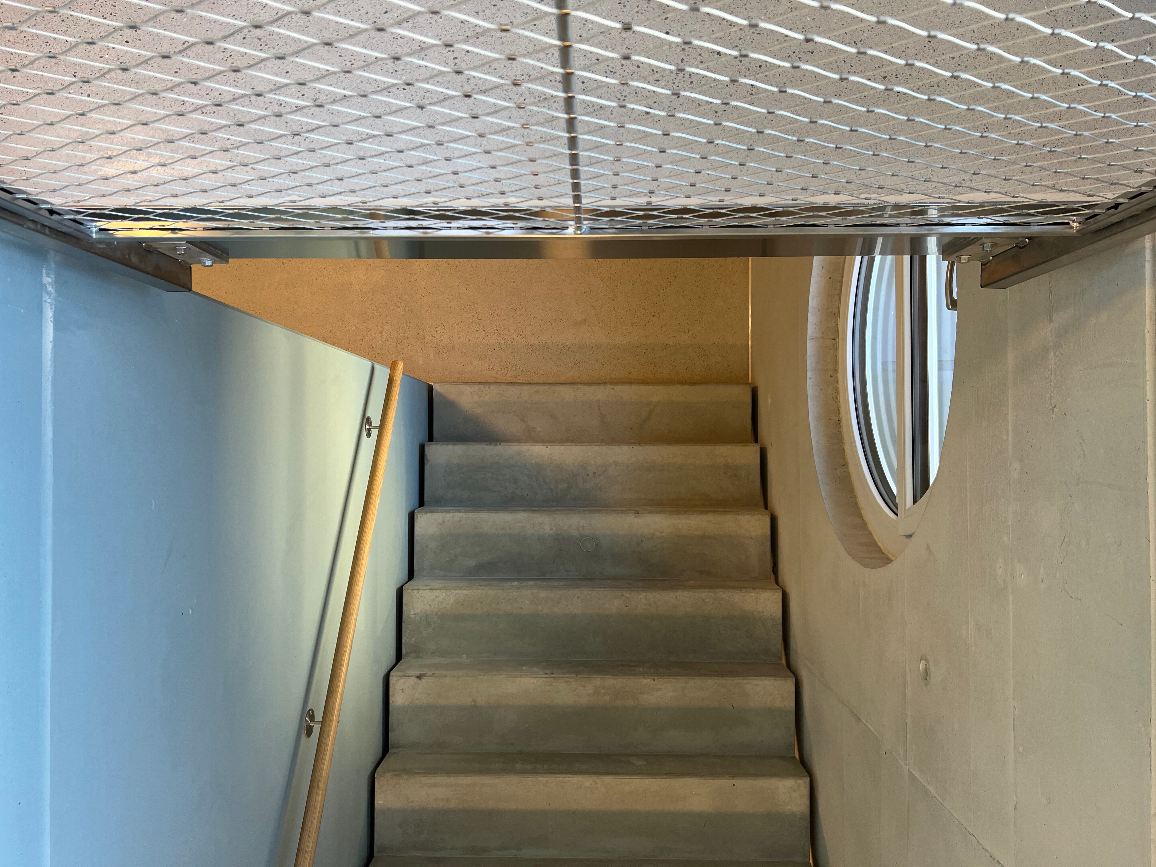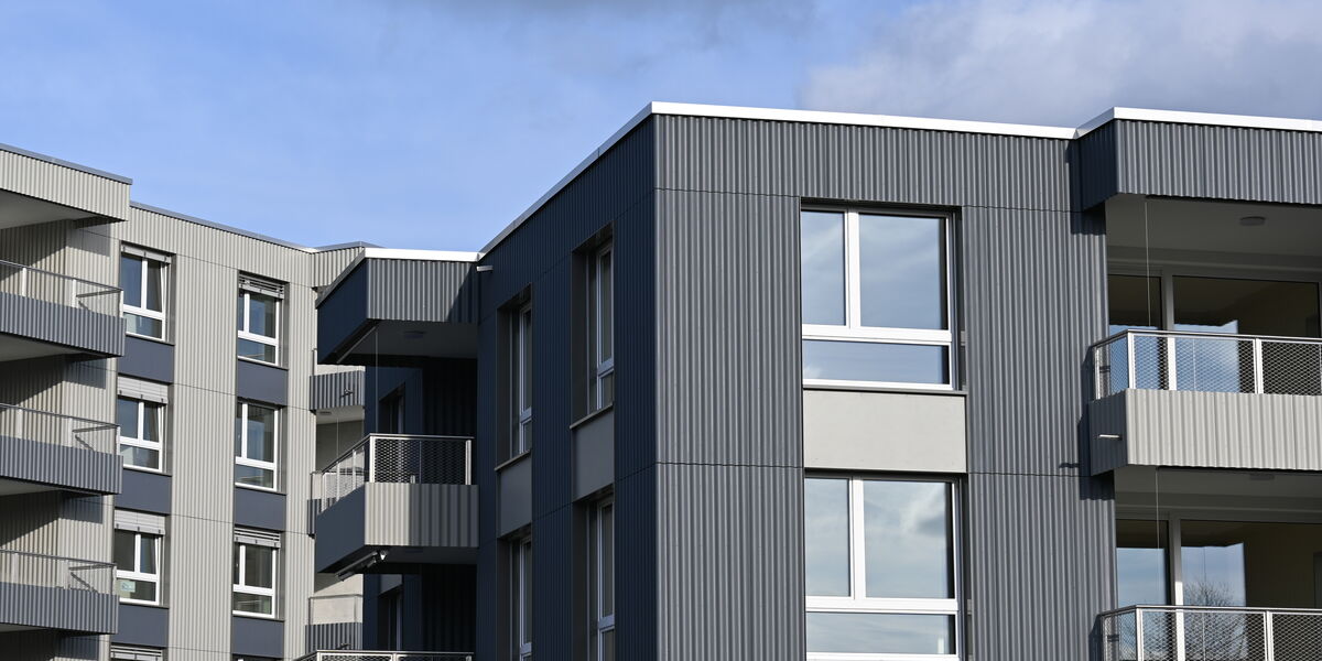 Auch das untere Drittel der Balkonverkleidungen ist mit Well-Eternit gestaltet, was zum einheitlichen Gesamtbild und zur Privatsphäre beiträgt.