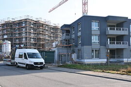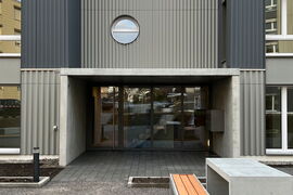 Die Fassade bedient sich bewusst einer modernen architektonischen Formensprache, auch im Hinblick auf die städtische Nähe. Die Einschnitte in der Fassade über alle Stockwerke hinweg an den Hauptzugängen, den Balkonen und Loggien verleihen den länglichen Gebäuden eine strukturierte Leichtigkeit. Die Anordnung der großen Fenster mit schlanken Rahmen lässt die Wohnräume, Zimmer und Nebenräume maximal ausleuchten.