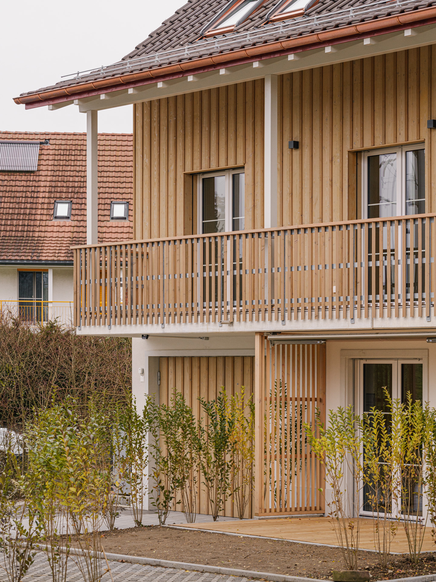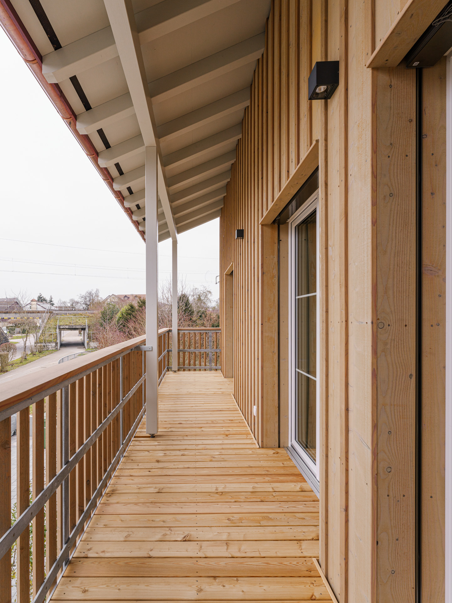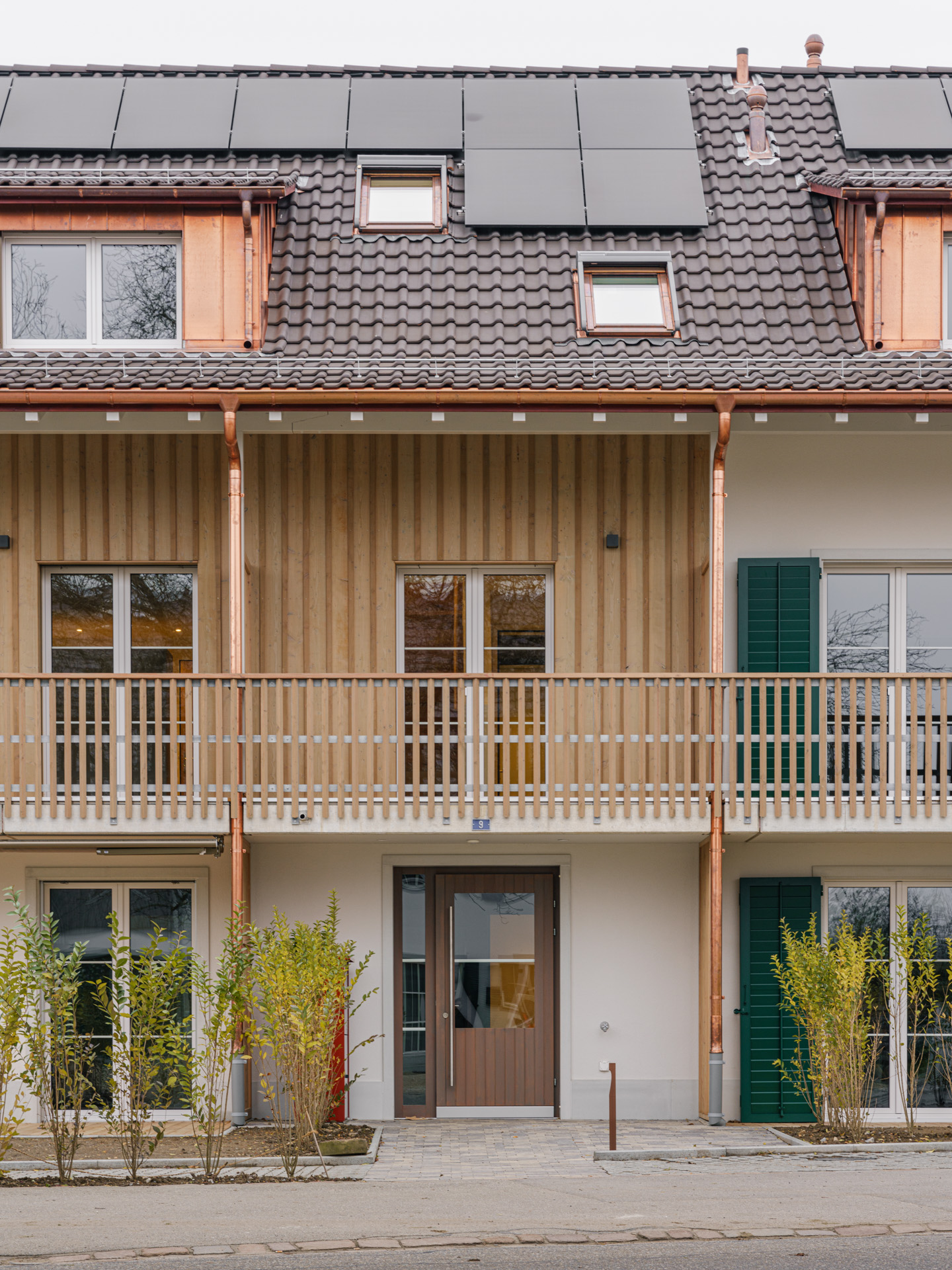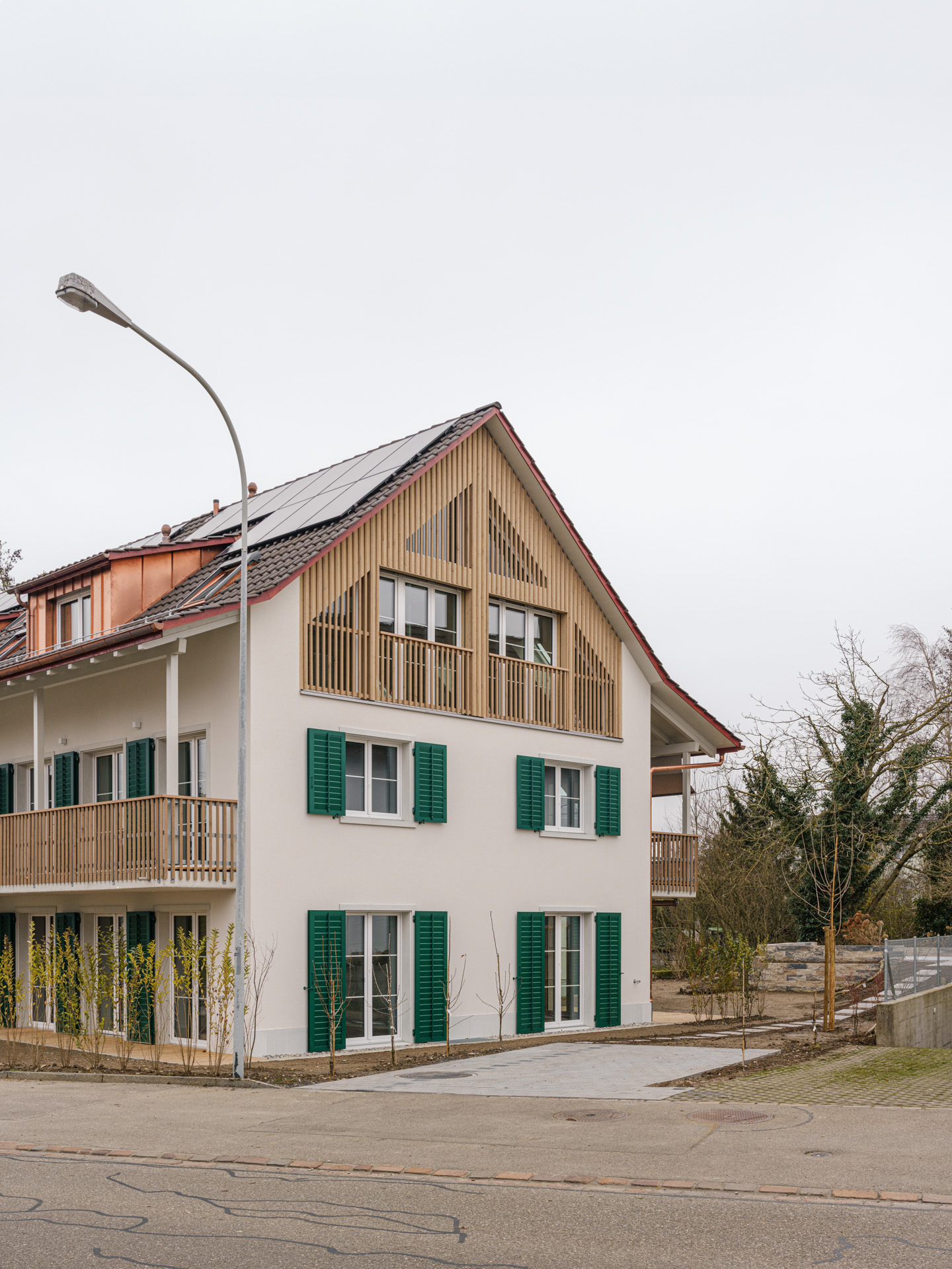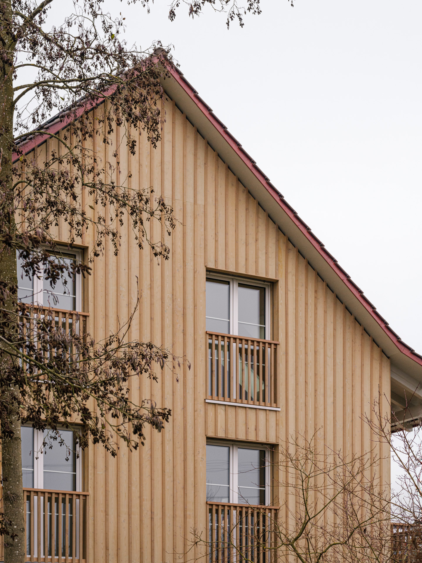 Insgesamt entstehen fünf Wohnungen. Die Einheiten im Erd- und Obergeschoss erstrecken sich jeweils quer über die Tiefe des Gebäudes. Ein Laubengang im Obergeschoss erstreckt sich entlang der gesamten Westseite, während die Dachwohnung die volle Länge des Gebäudes nutzt und somit alle vier Himmelsrichtungen bedient.