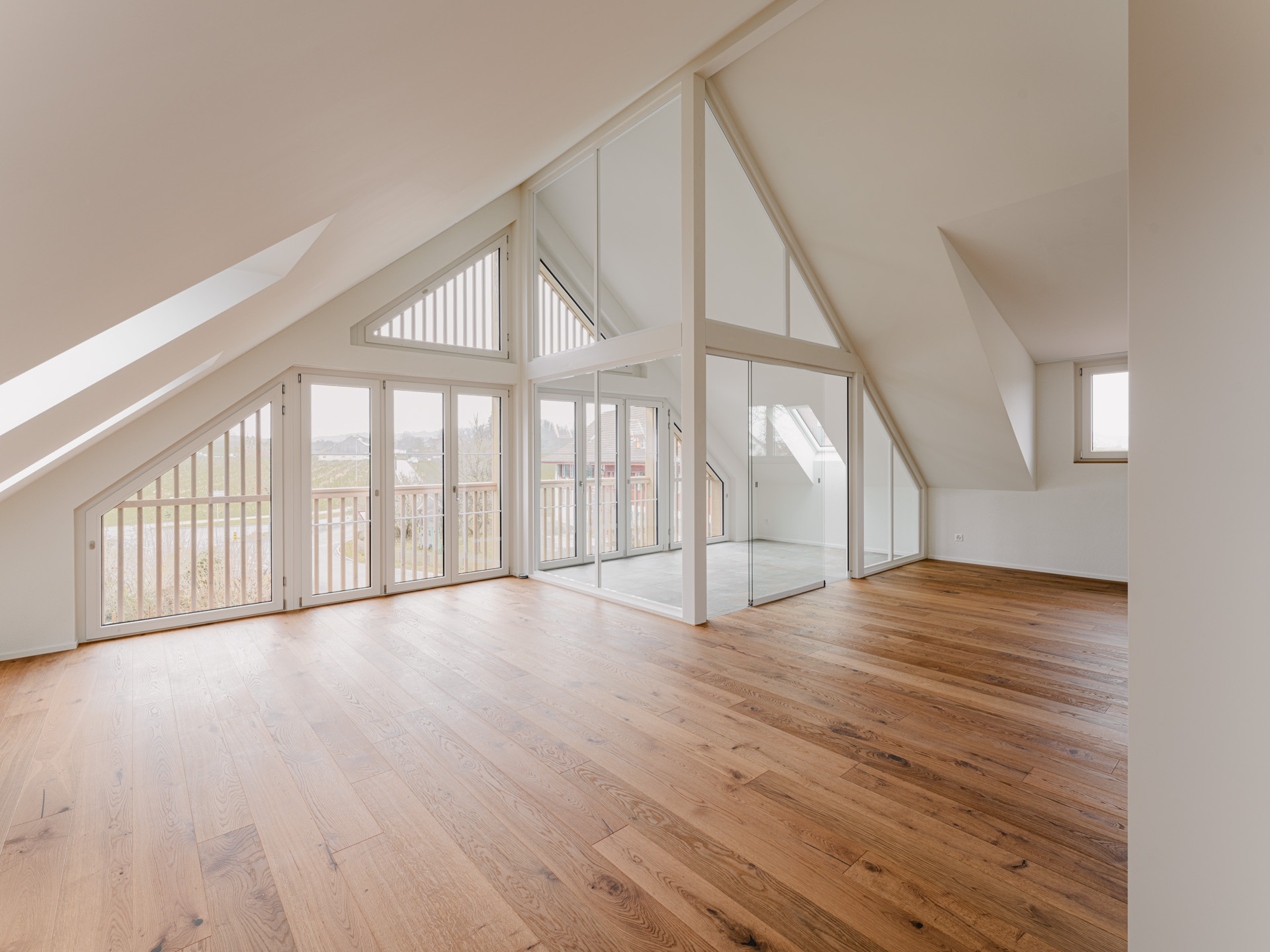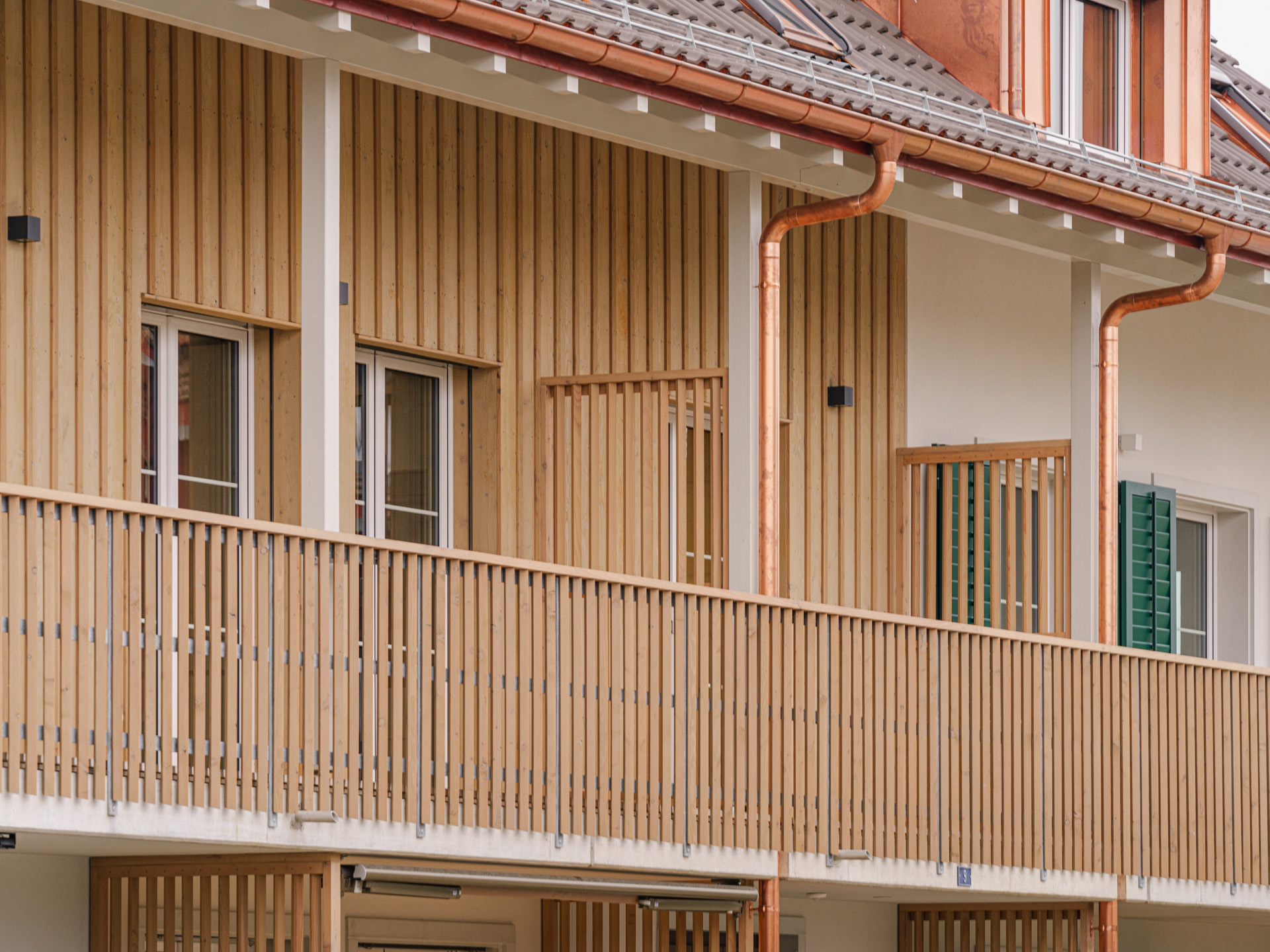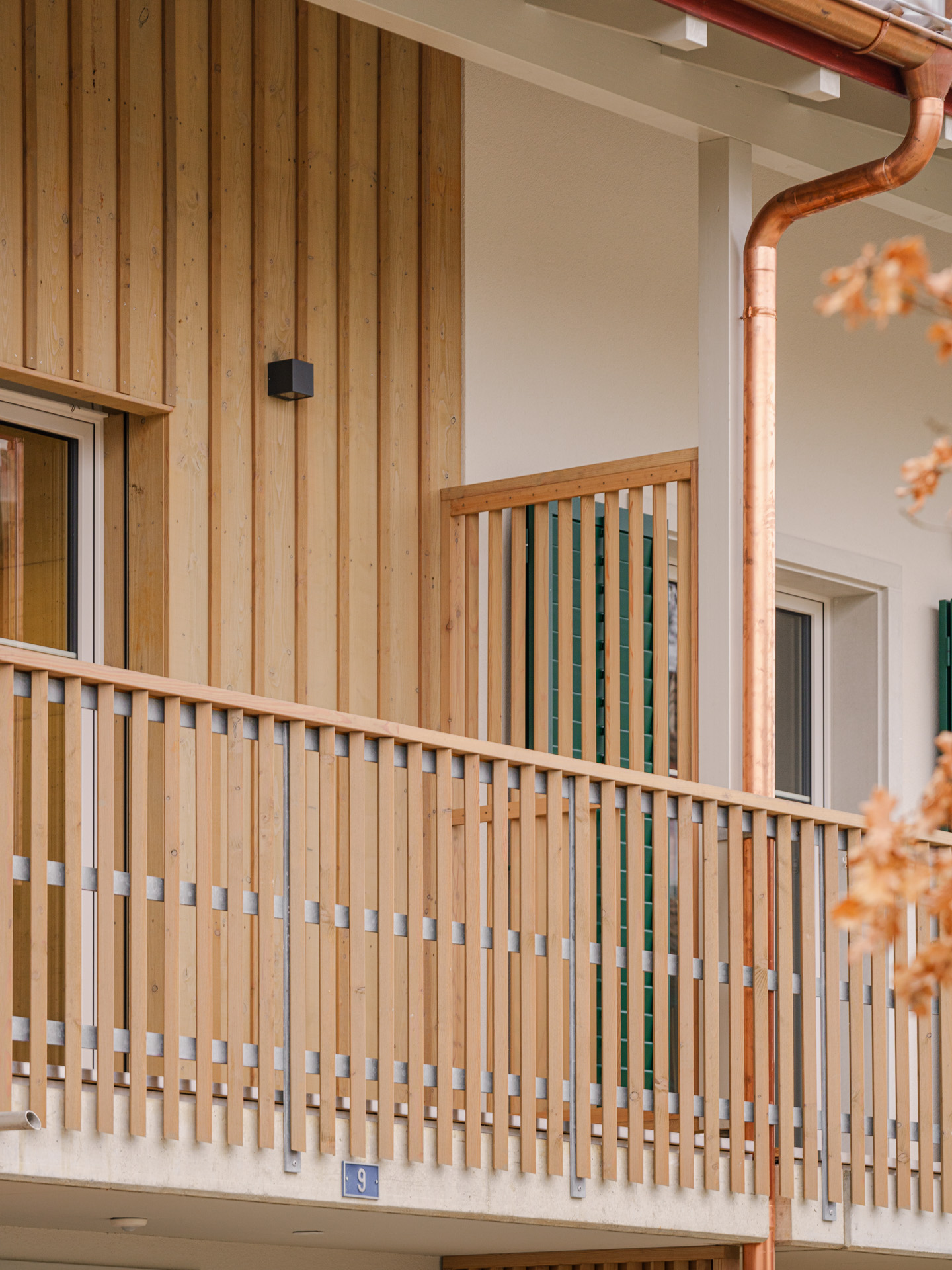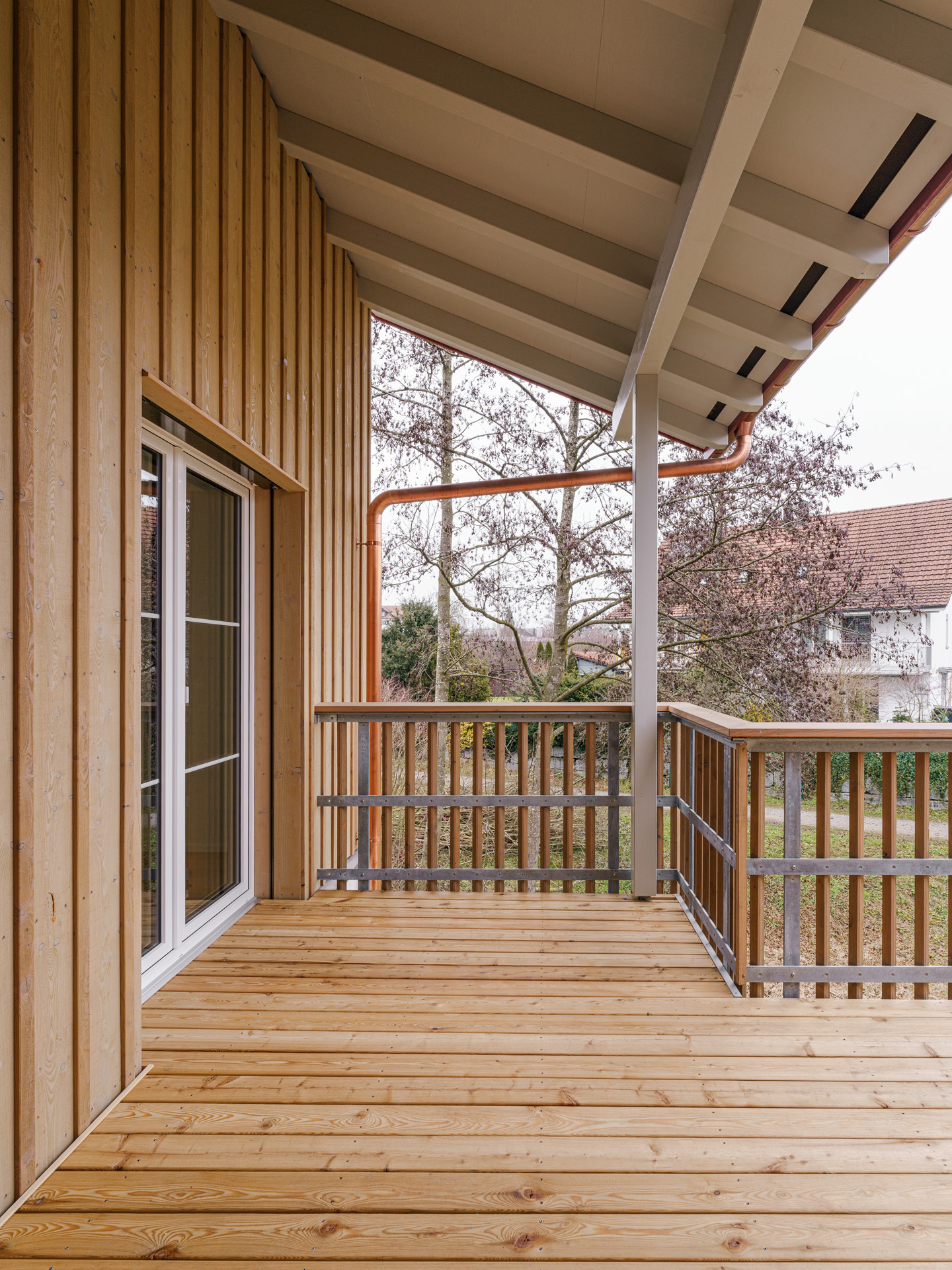 Insgesamt entstehen fünf Wohnungen. Die Einheiten im Erd- und Obergeschoss erstrecken sich jeweils quer über die Tiefe des Gebäudes. Ein Laubengang im Obergeschoss erstreckt sich entlang der gesamten Westseite, während die Dachwohnung die volle Länge des Gebäudes nutzt und somit alle vier Himmelsrichtungen bedient.