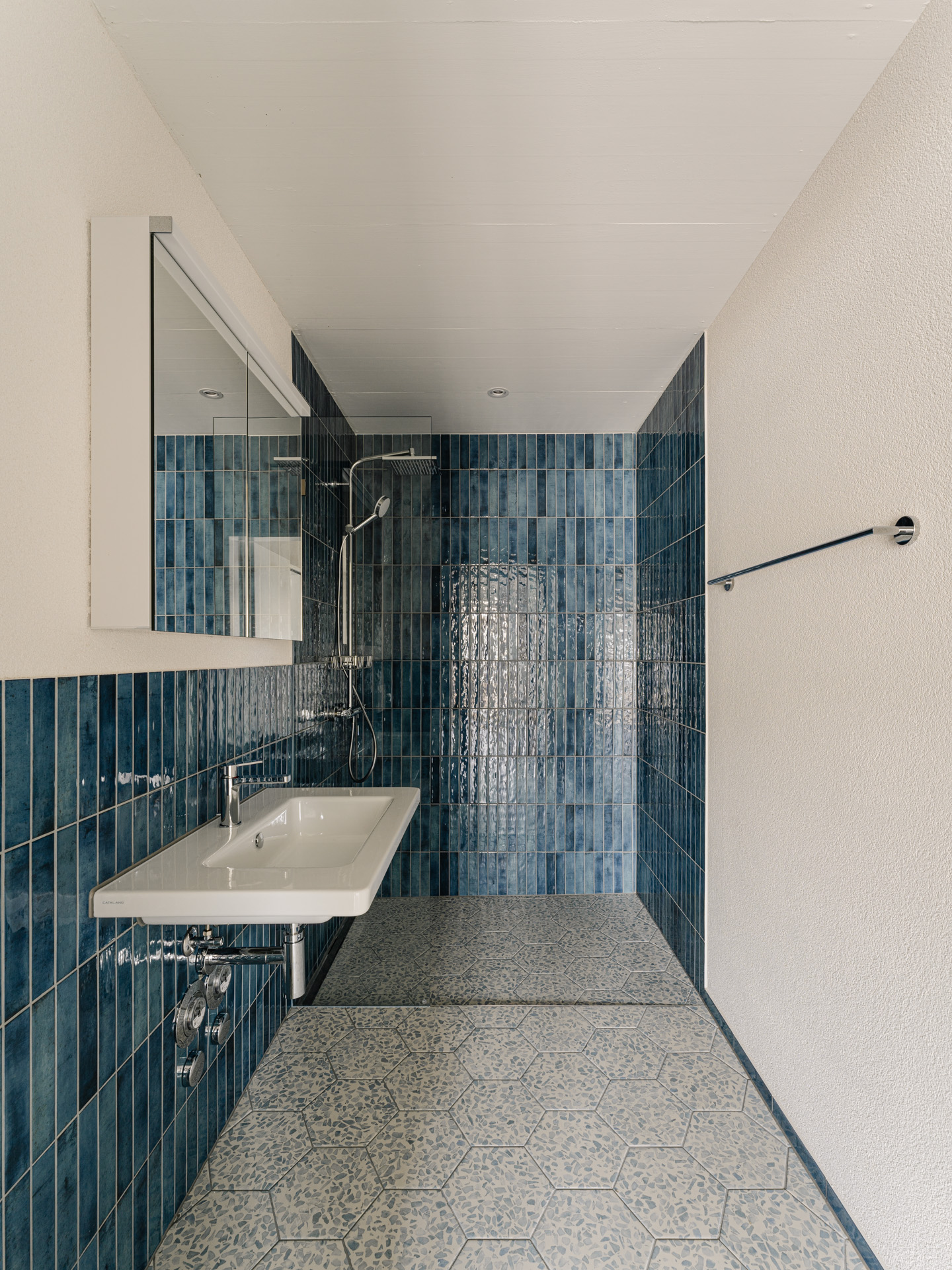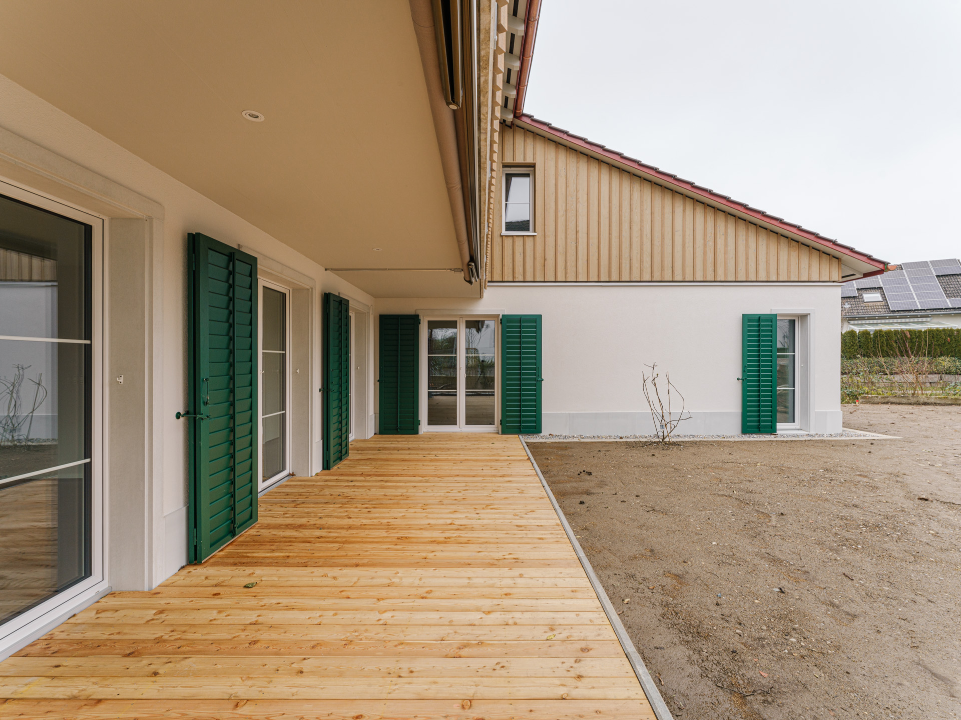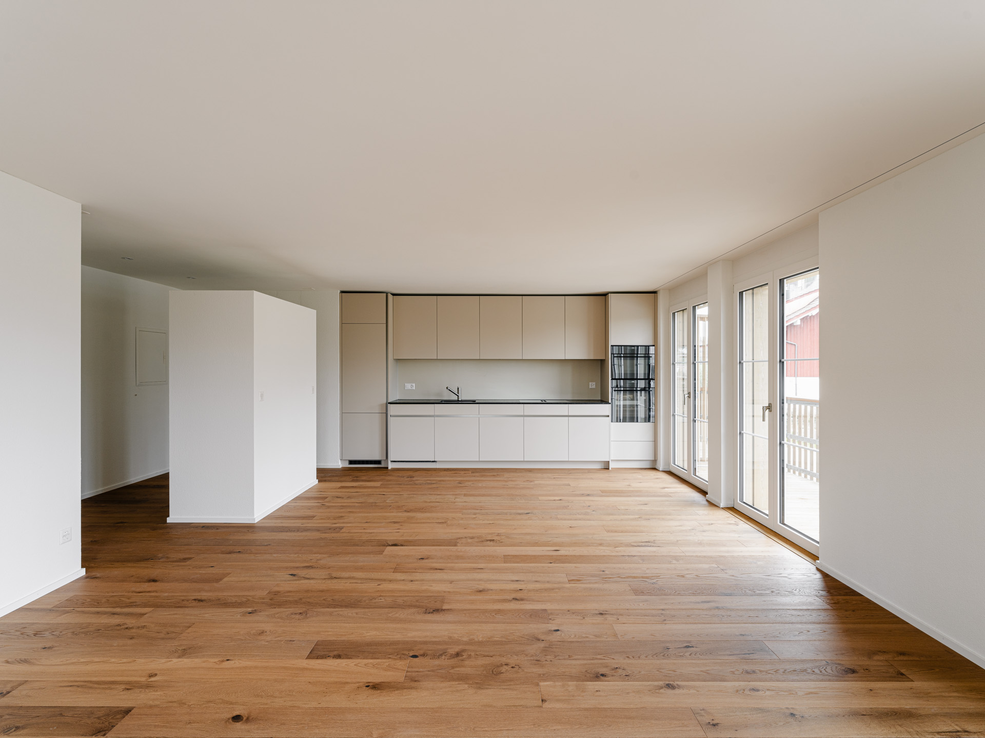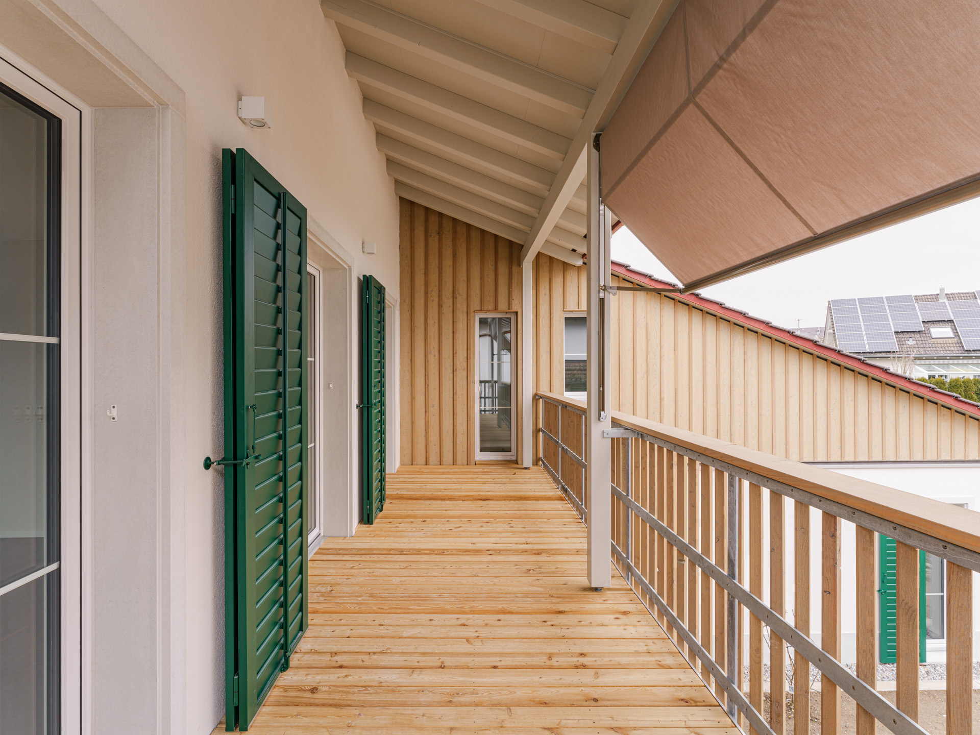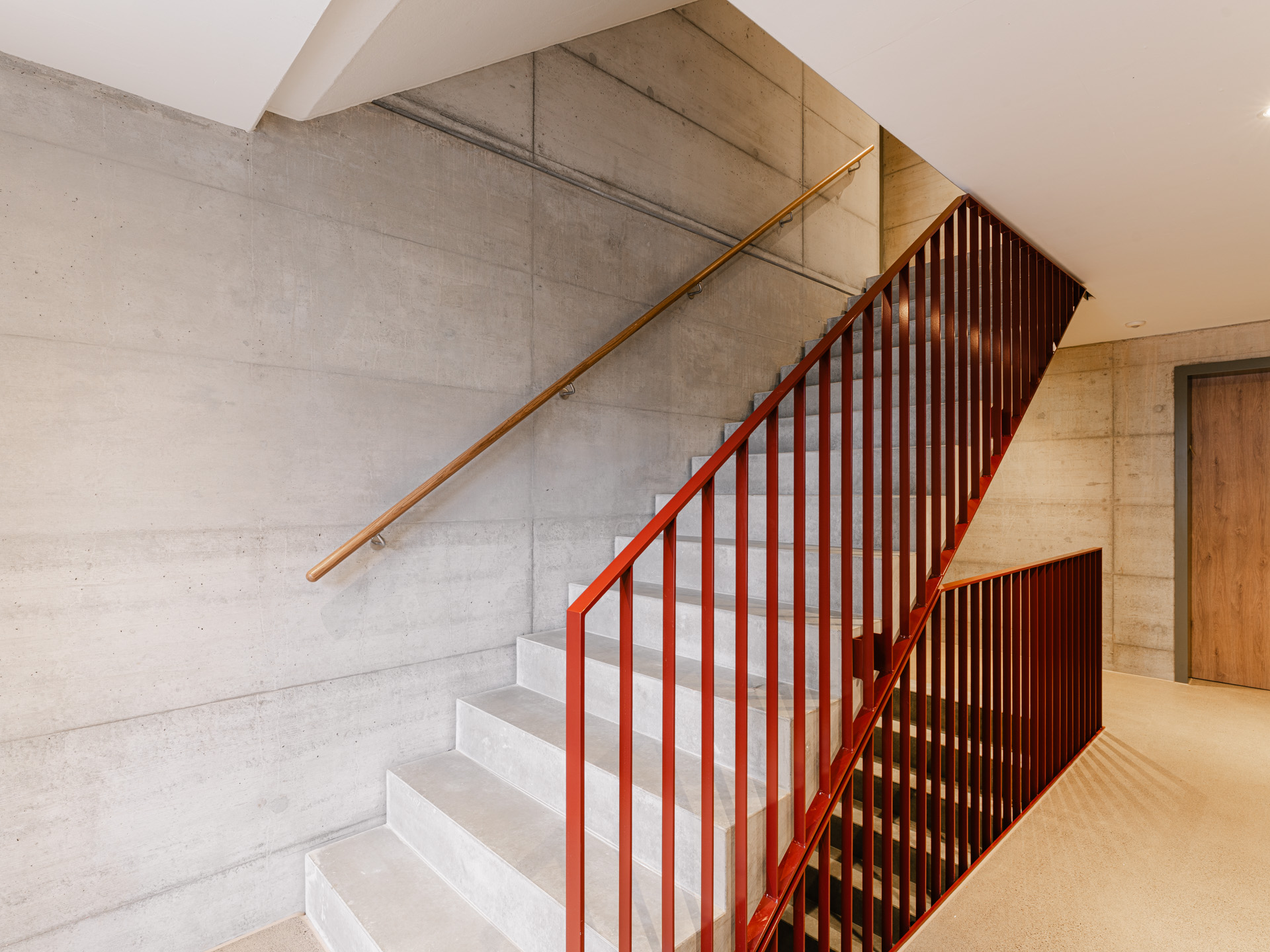 Insgesamt entstehen fünf Wohnungen. Die Einheiten im Erd- und Obergeschoss erstrecken sich jeweils quer über die Tiefe des Gebäudes. Ein Laubengang im Obergeschoss erstreckt sich entlang der gesamten Westseite, während die Dachwohnung die volle Länge des Gebäudes nutzt und somit alle vier Himmelsrichtungen bedient.