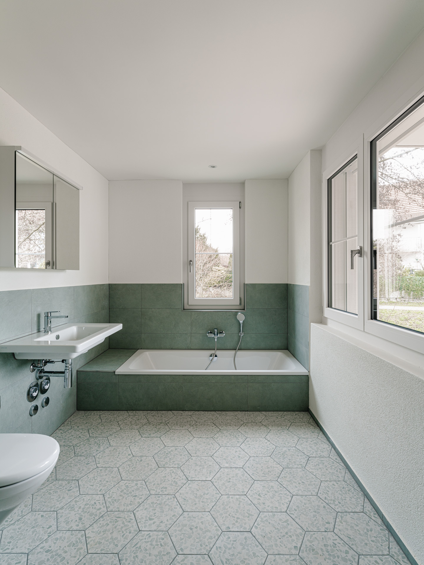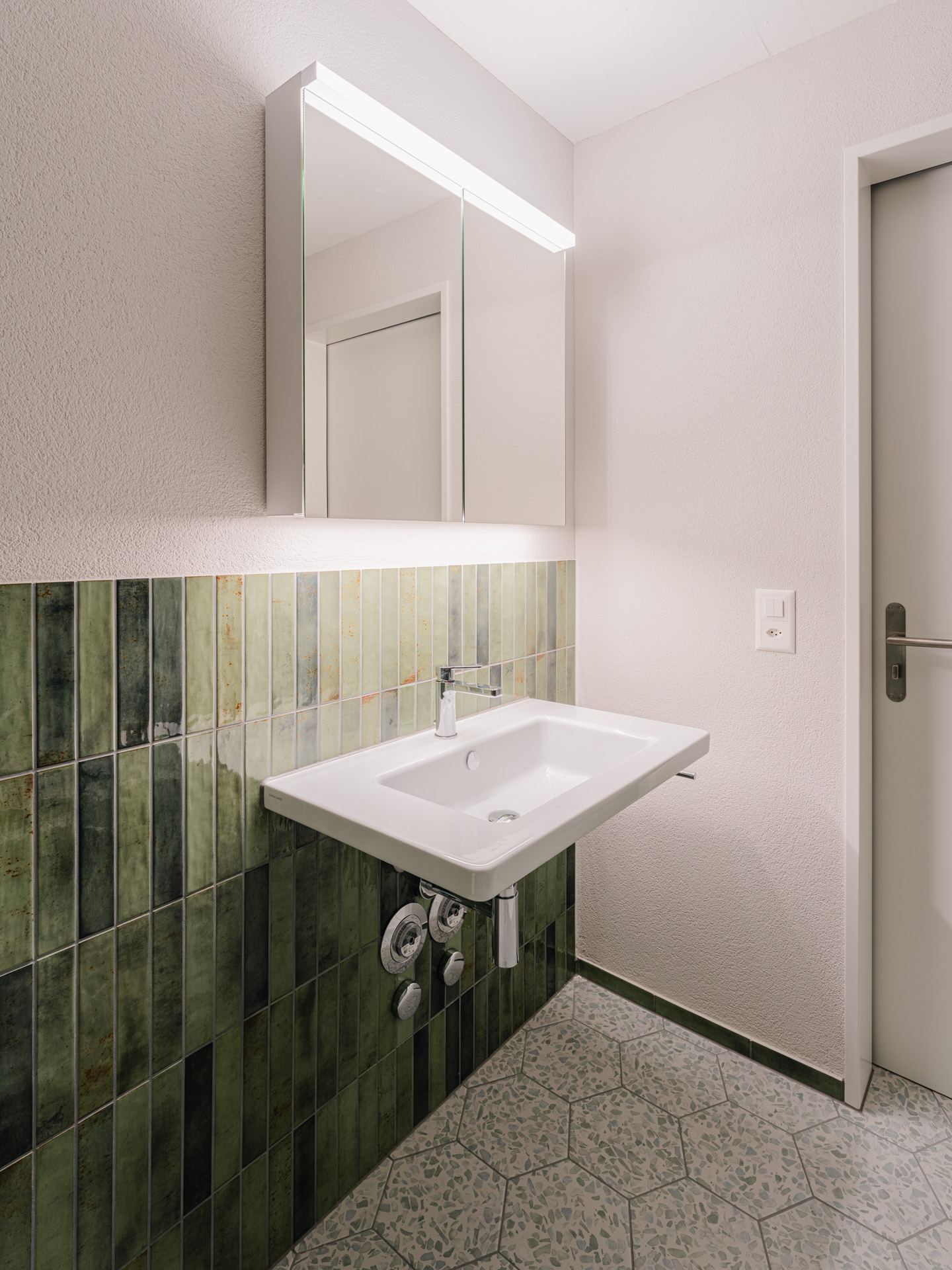 Die Materialwahl des Neubaus orientiert sich am früheren Gebäude. Im Erdgeschoss wird über dem steinernen filigranen Sockel das Mauerwerk verputzt, während die Fassade darüber hinterlüftet wird. Eine vertikale Gliederung verleiht dem Gebäude Rhythmus und Struktur. Durch die Verwendung früherer architektonischer Elemente fügt sich der Neubau würdevoll in das Quartier Schliiffi ein.