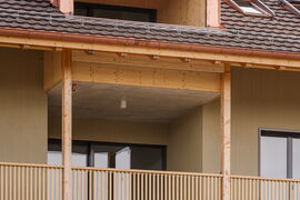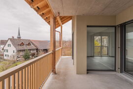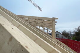 Der flach geneigte Dachstuhl mit seinen filigran gestalteten Gauben verweist auf die hohe handwerkliche Kunst der Zimmerleute. Insgesamt entstehen 5 Familienwohnungen.