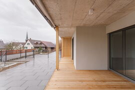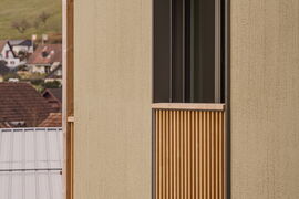 Ein charakteristisches Merkmal ist der Laubengang, der sowohl als Außenraum für die Bewohner dient als auch als konstruktiver Sonnenschutz fungiert, um die Innenräume an heißen Sommertagen angenehm kühl zu halten. Die Gestaltung der Fenstergewände, die in der Kernzone von Weiach häufig anzutreffen sind, wird in der Fassade durch schmal ausgestaltete Metallgewände aufgenommen. Eine Zweifarbigkeit der Außenfassade gliedert das Gebäude optisch.
