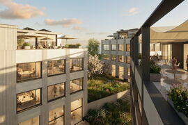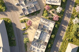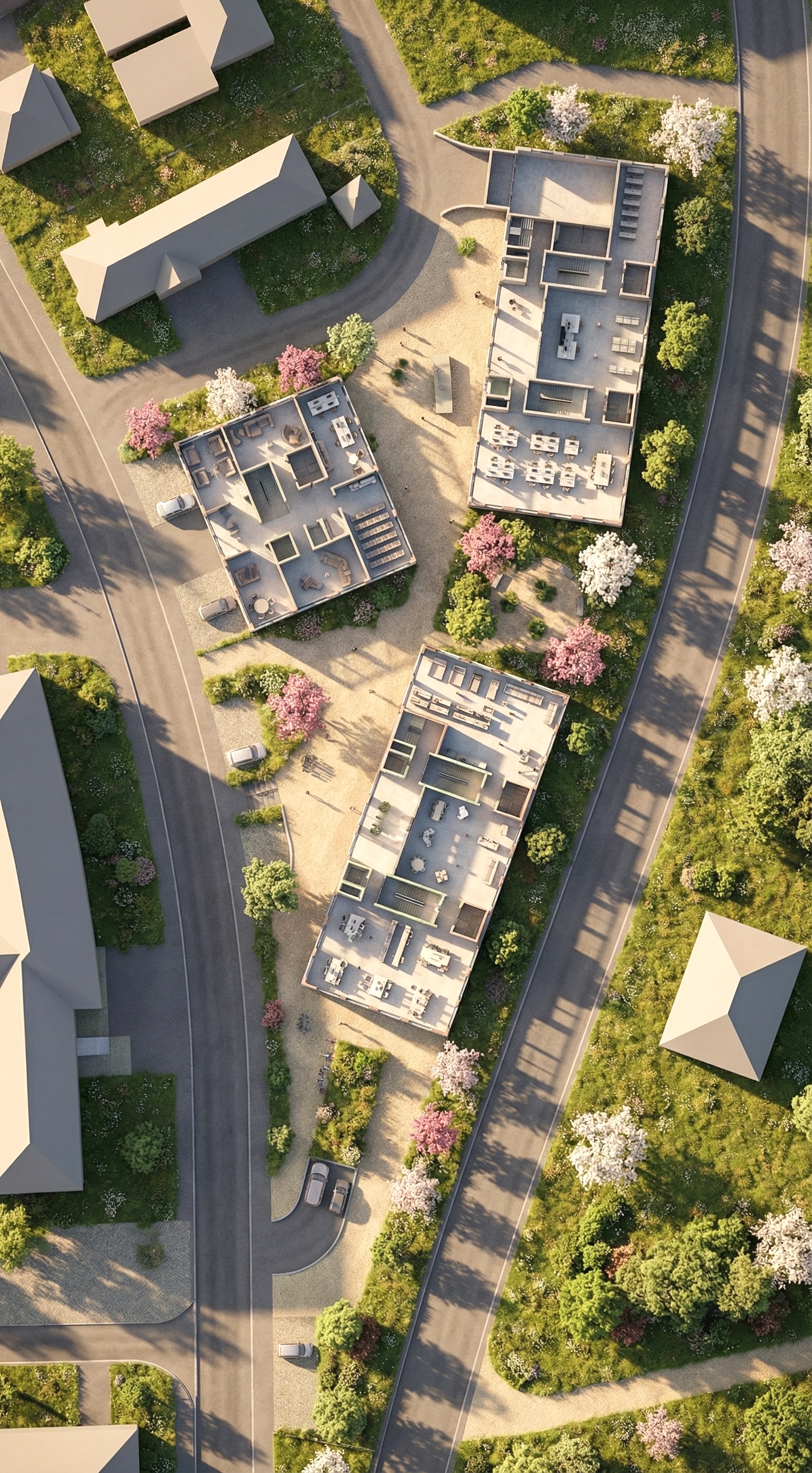 Grosszügig dimensionierte Vorplätze vor den jeweiligen Gebäudeeingängen übernehmen die Funktion der Adressbildung und dienen gleichzeitig als Begegnungs- und Aufenthaltszonen. Diese Vorbereiche stärken die Lesbarkeit der einzelnen Gebäudekomplexe und ermöglichen eine klare Orientierung für Nutzerinnen und Nutzer sowie Besucherinnen und Besucher.