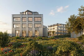 Die geplanten Gewerbebauten bestehen aus insgesamt drei klar ablesbaren Neubauvolumen, welche sich städtebaulich entlang der Hauptstrasse orientieren und so eine prägnante Präsenz im Strassenraum ausbilden. Die eigentliche Erschliessung und Adressierung der Gebäude erfolgt bewusst von der rückwärtig gelegenen Quartierstrasse her. Dadurch wird der Verkehr von der Hauptstrasse entlastet und eine ruhige, gut zugängliche Eingangssituation geschaffen.