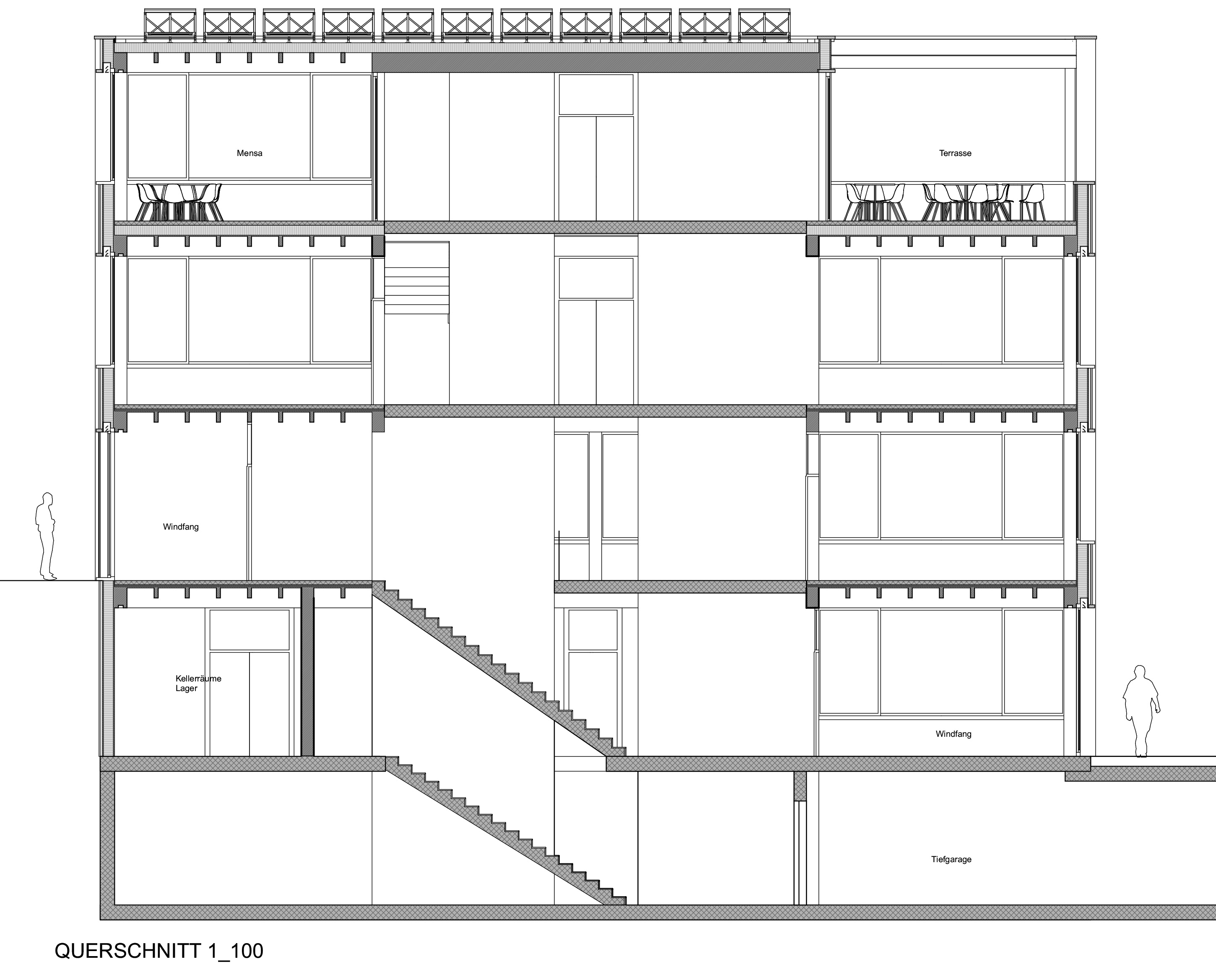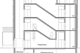 Konstruktiv sind die Gebäude als hybride Bauweise konzipiert. Die vertikalen Erschliessungskerne, welche Treppenhäuser und Liftanlagen aufnehmen, werden in Ortbeton ausgeführt. Diese Bauweise gewährleistet einerseits die erforderliche statische Stabilität der Gesamtstruktur und stellt andererseits die notwendigen Anforderungen an den Brandschutz sowie die sichere Ausführung der Fluchtwege sicher. Zwischen den massiven Erschliessungskernen spannt sich eine hybride Holzkonstruktion, welche eine nachhaltige Bauweise mit hoher Flexibilität verbindet.