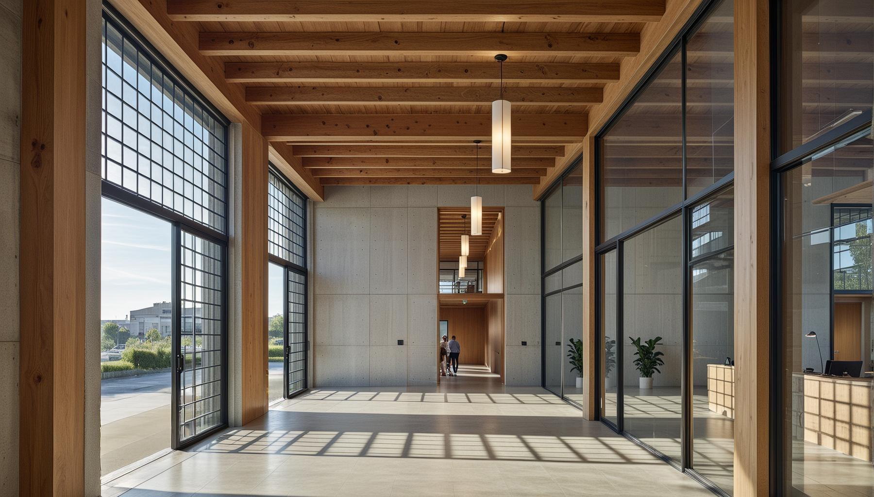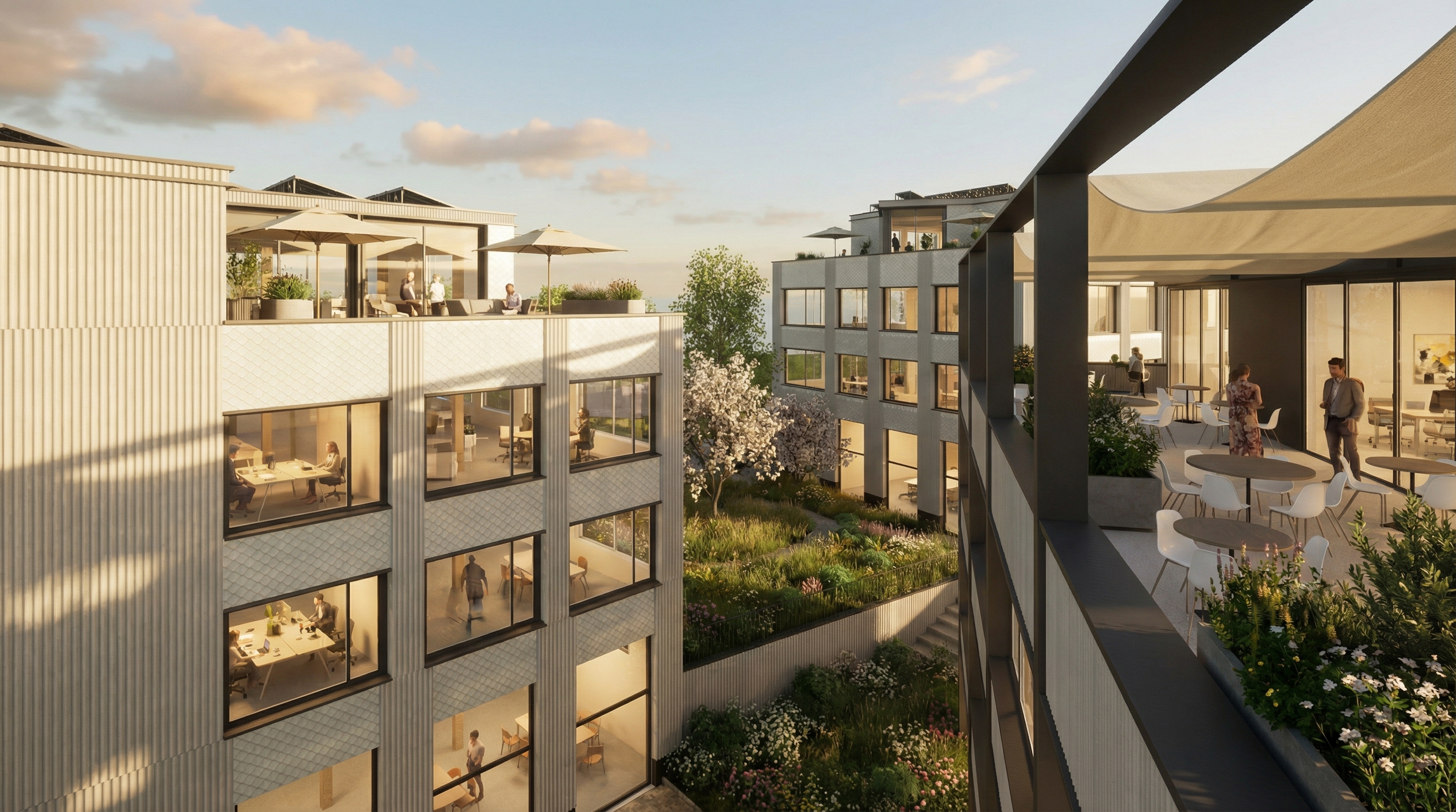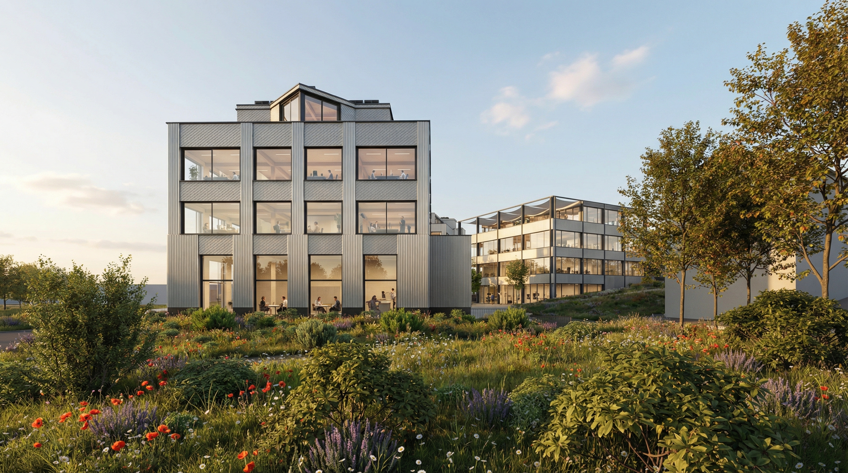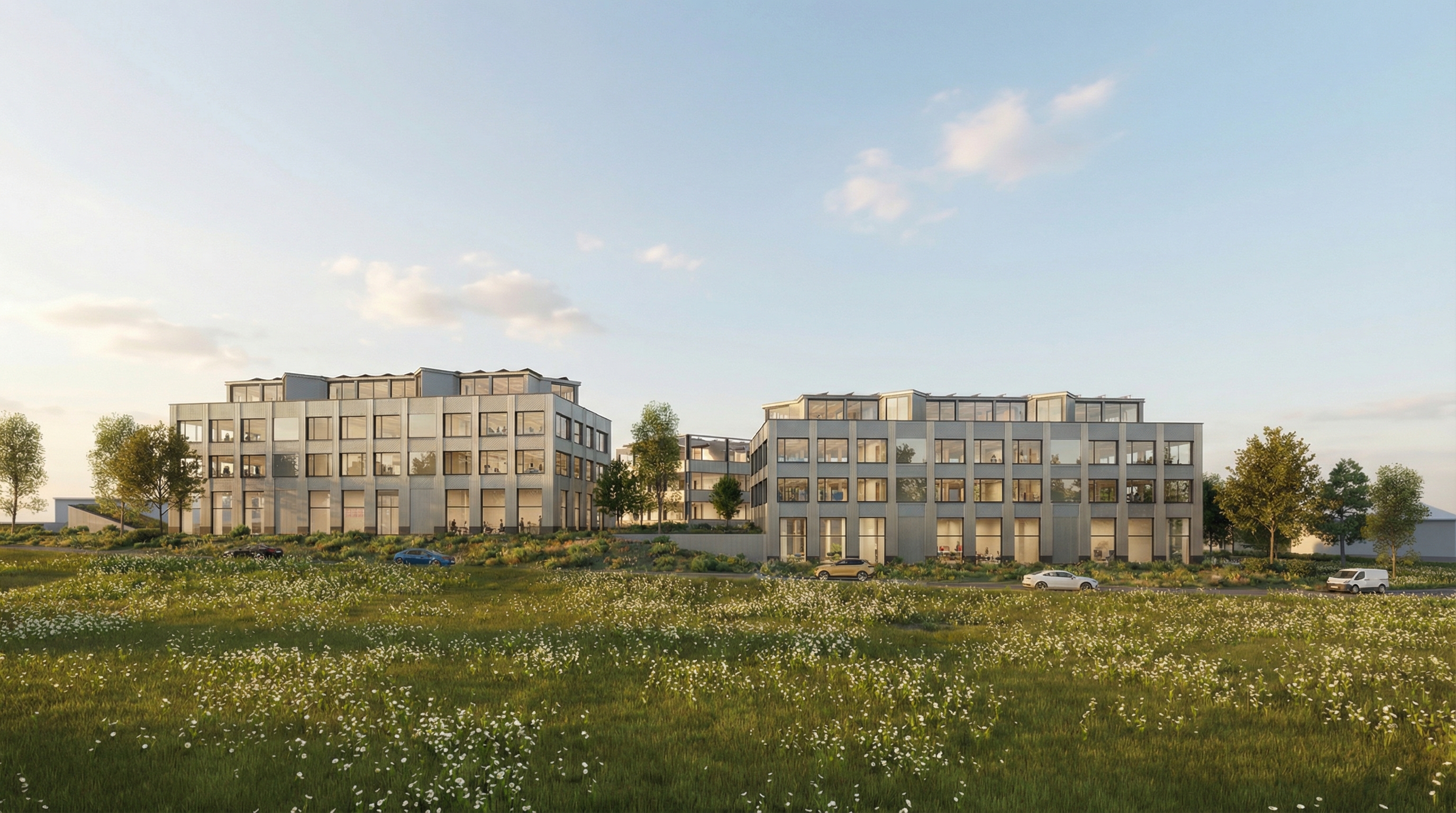 Die Fassaden werden mit einer hinterlüfteten Metallverkleidung ausgeführt. Diese robuste und langlebige Materialisierung trägt wesentlich zur Reduktion des Unterhaltsaufwandes bei und verleiht den Gebäuden zugleich einen zeitgemässen, industriell geprägten Ausdruck, der dem Charakter der gewerblichen Nutzung entspricht.
