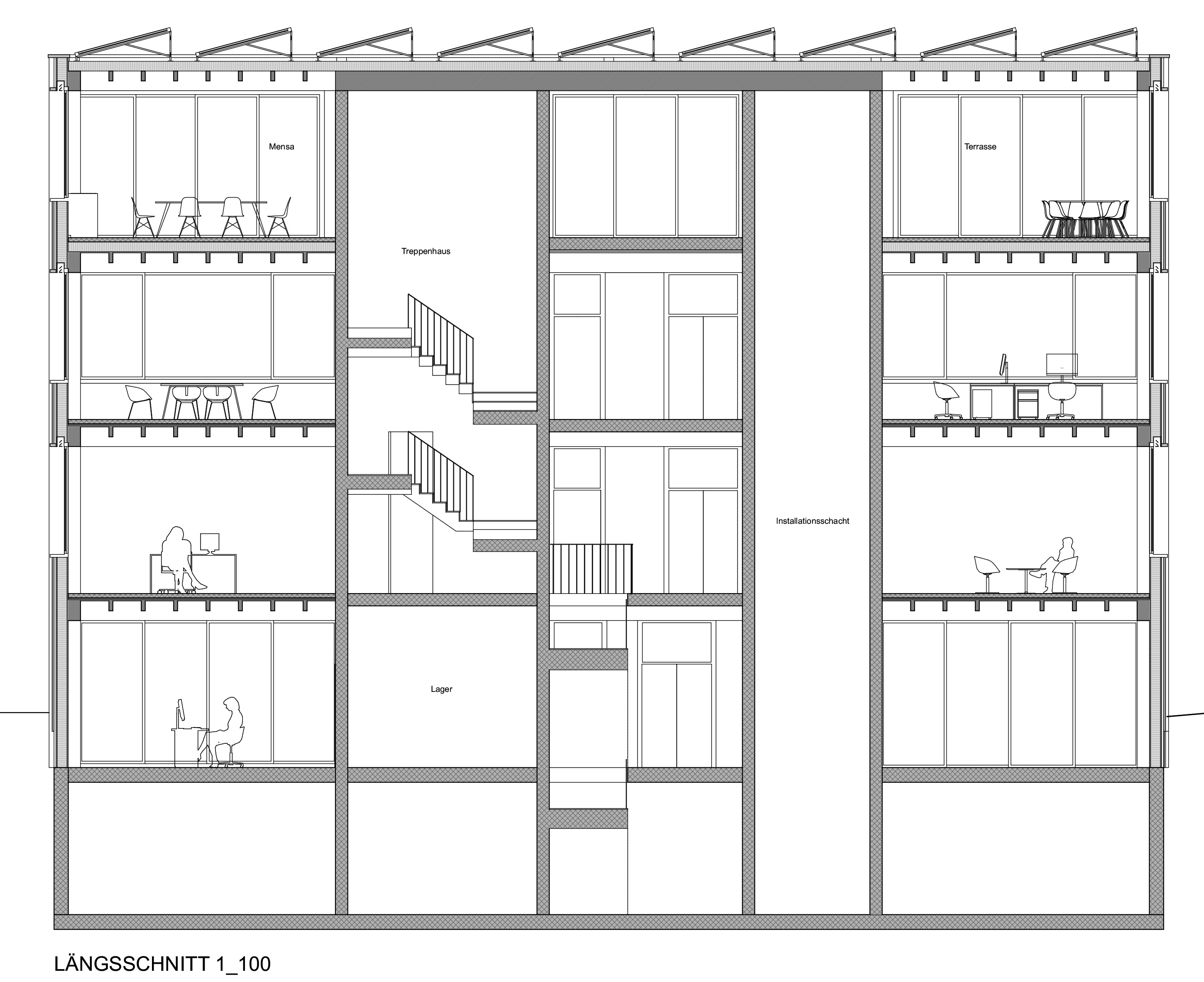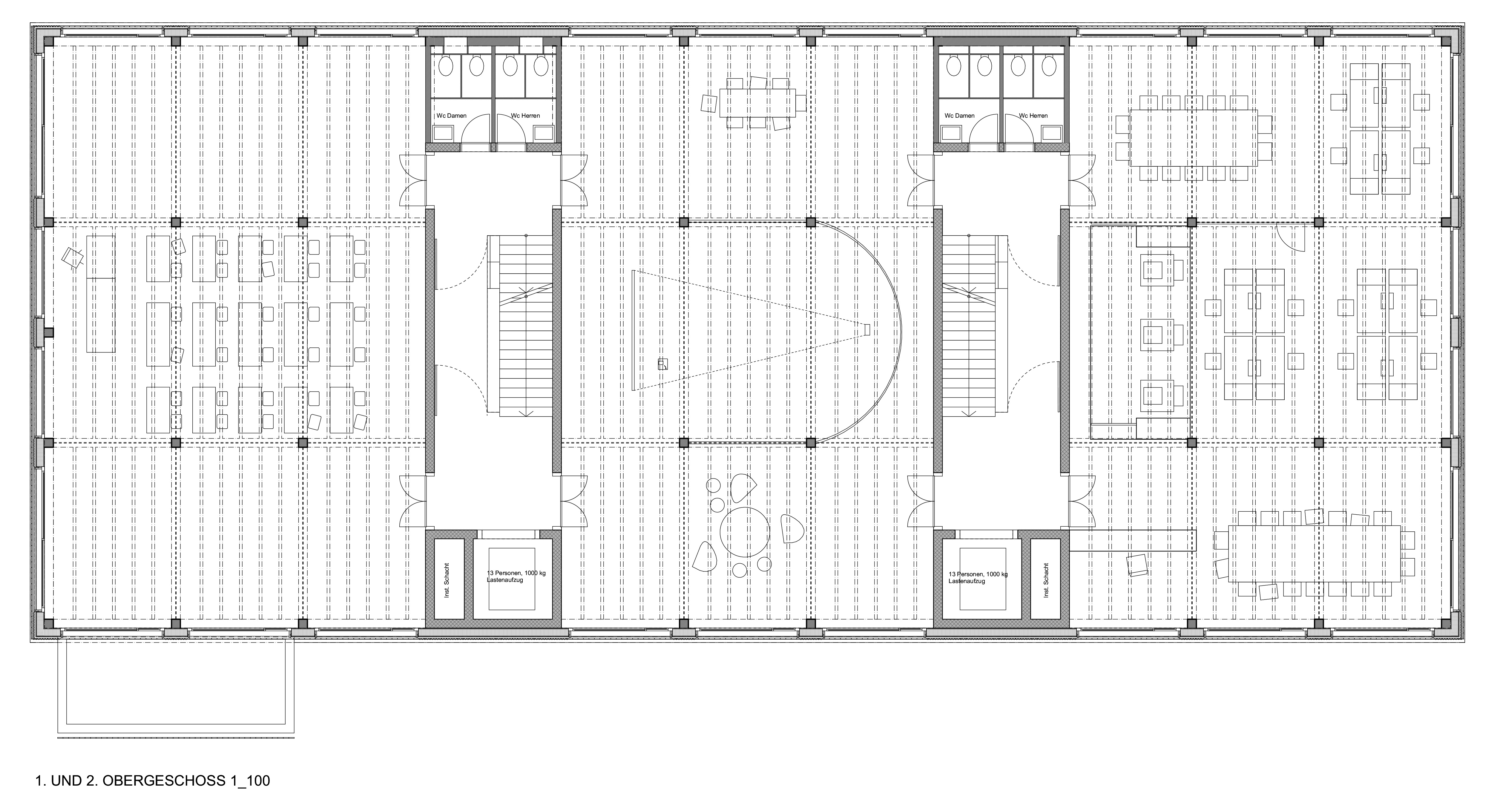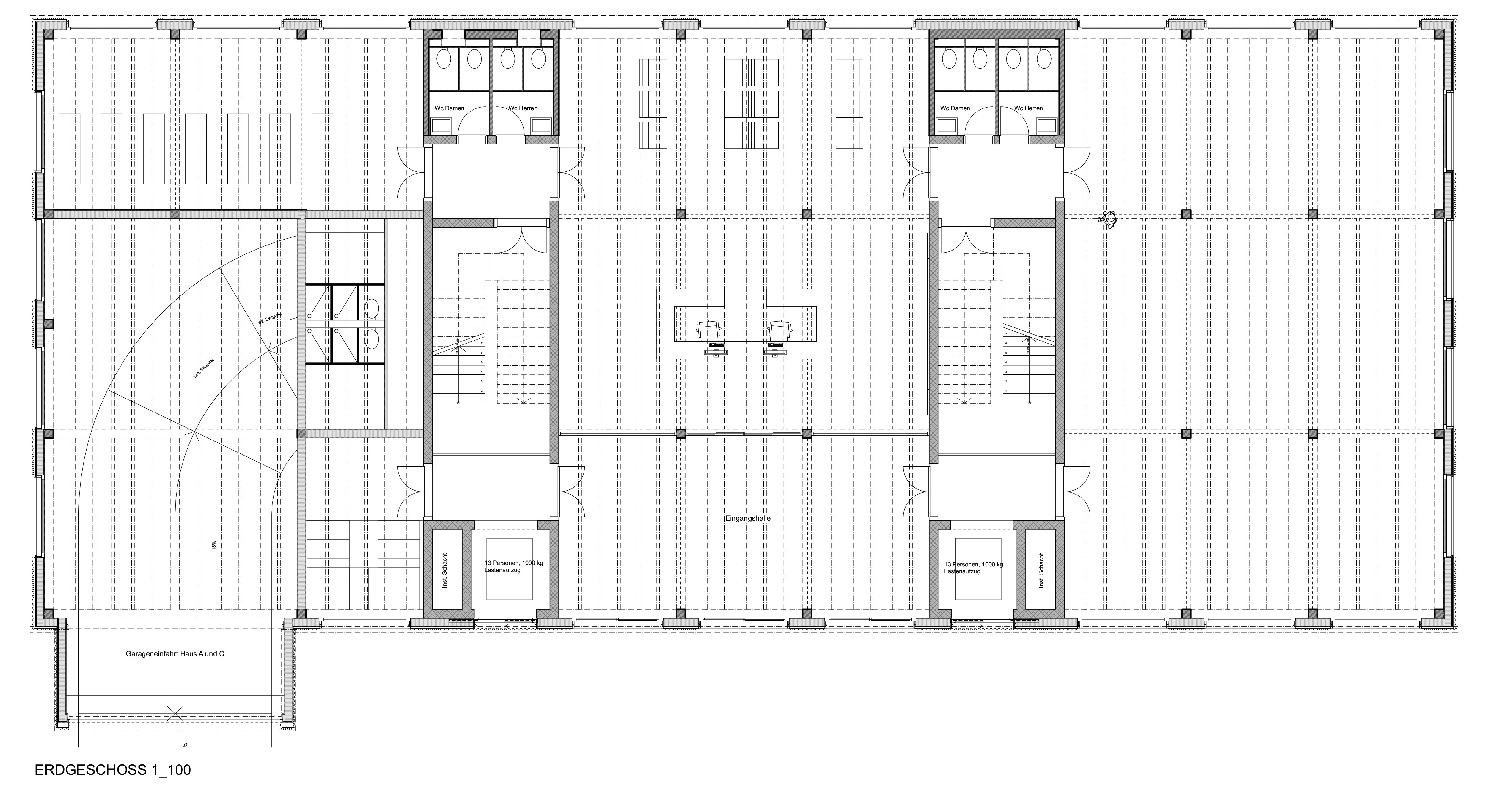 Ein zentrales Anliegen der Bauherrschaft war die Möglichkeit einer vielseitigen und langfristig anpassbaren Nutzung. Entsprechend wurde grosser Wert auf eine flexible Grundrissgestaltung gelegt. Die Gewerbeflächen lassen sich je nach Bedarf in unterschiedliche Einheiten unterteilen und ermöglichen sowohl Kleinnutzerflächen ab ca. 90 m² als auch Grossnutzerflächen bis zu 546 m² pro Geschoss. Diese Variabilität erlaubt eine breite Nutzungsdurchmischung und eine Anpassung an sich verändernde Marktbedürfnisse über den gesamten Lebenszyklus der Gebäude.