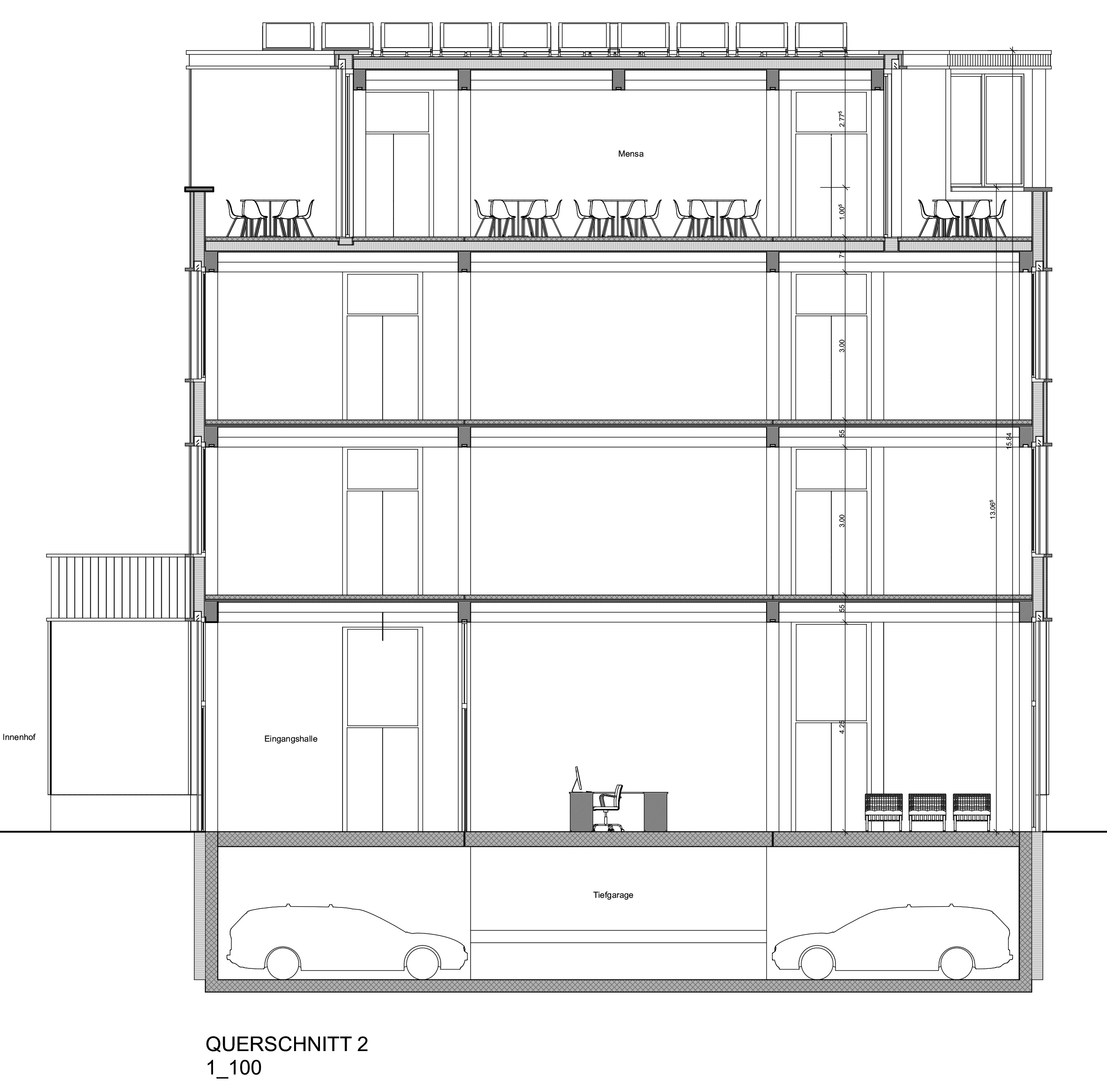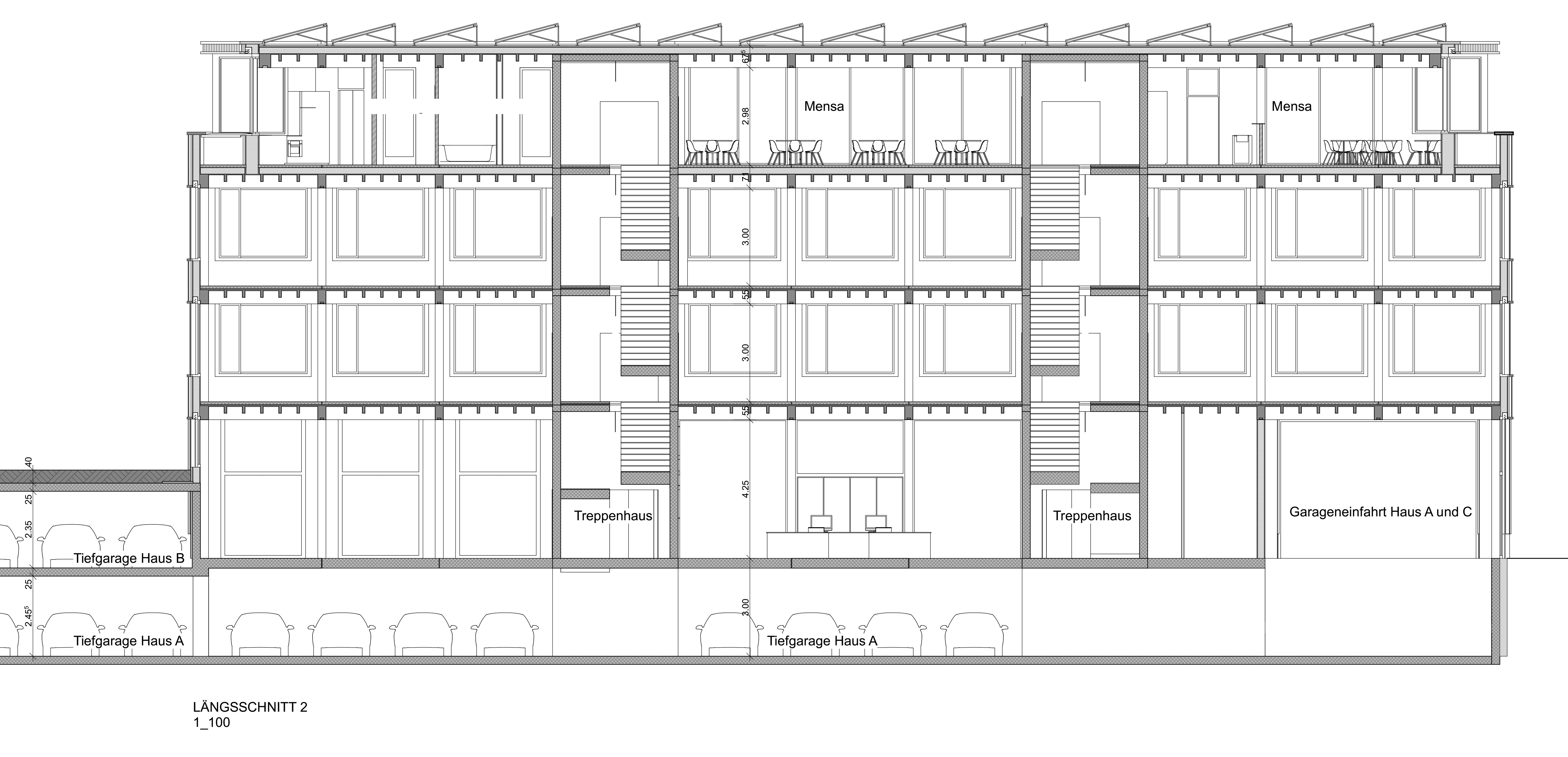 Alle drei Gebäude verfügen über jeweils vier Vollgeschosse. Die lichten Raumhöhen variieren je nach Nutzung und Geschoss zwischen ca. 4.25 m in den unteren Ebenen und ca. 3.00 m in den oberen Geschossen, wodurch sowohl gewerbliche als auch produktionsnahe Nutzungen möglich sind.