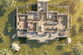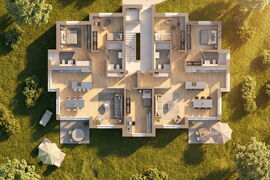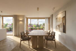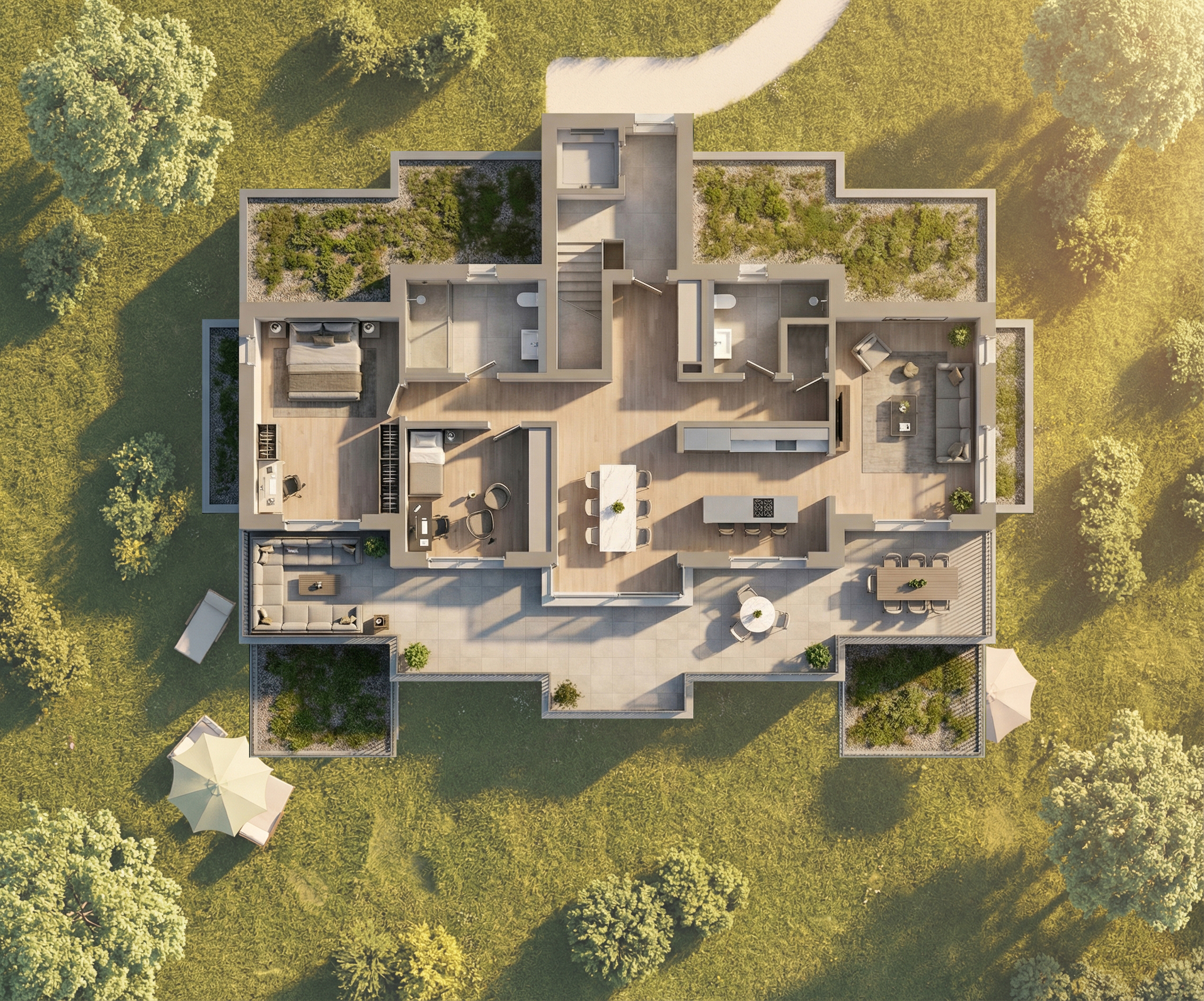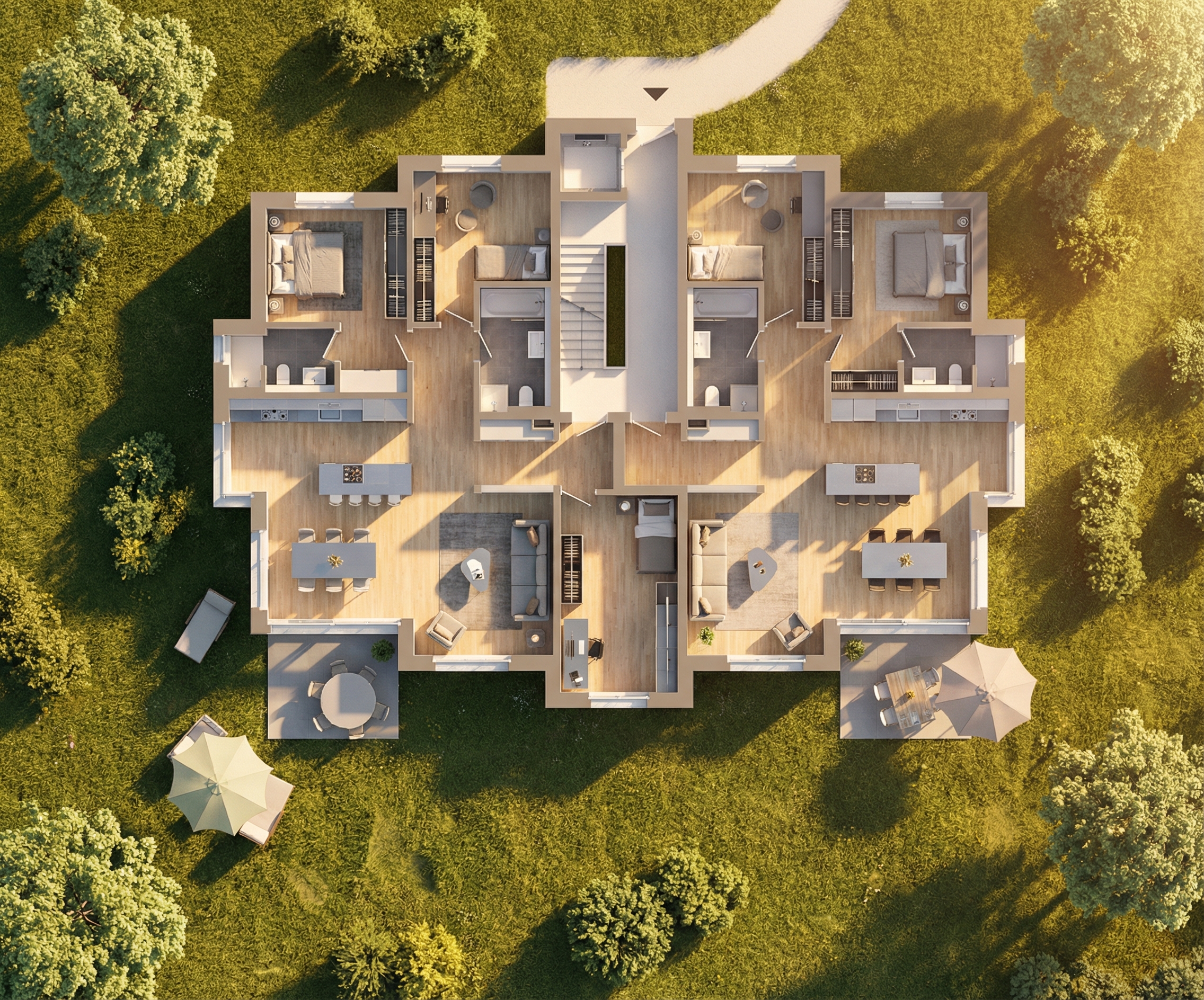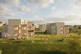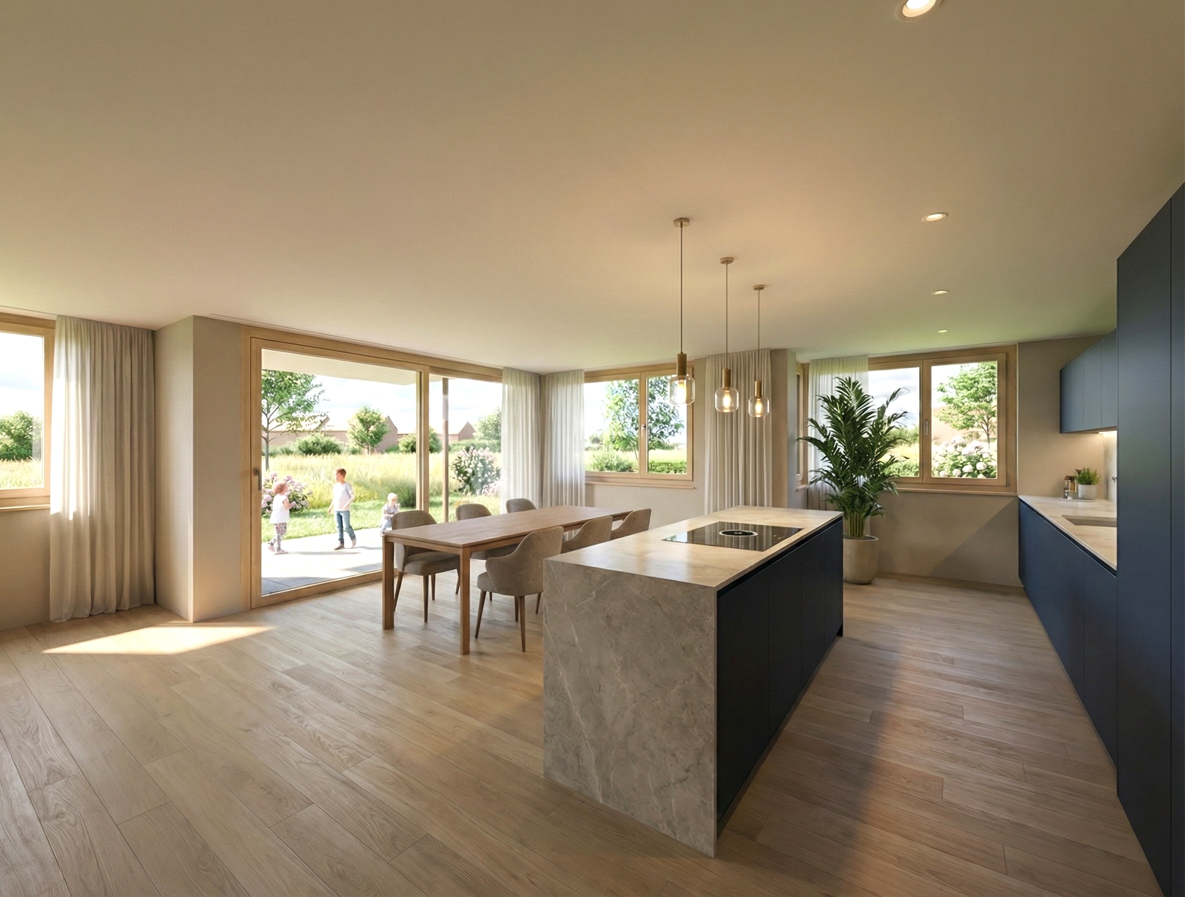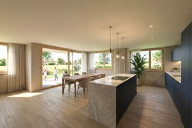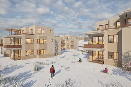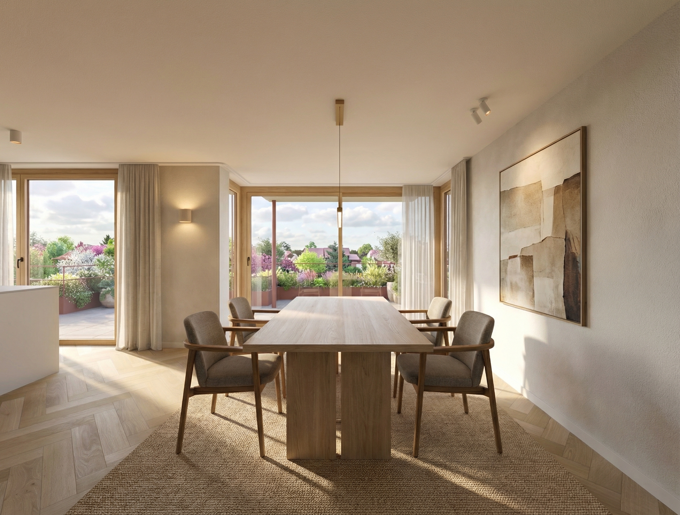 Insgesamt umfasst die Wohnüberbauung 15 Wohnungen mit einem ausgewogenen Mix aus 4.5-, 3.5- und 2.5-Zimmer-Wohnungen. Diese Vielfalt ermöglicht die Ansprache unterschiedlicher Haushaltsformen, von Einzelpersonen über Paare bis hin zu Familien. Die Wohnungen sind funktional und effizient organisiert, mit klar gegliederten Wohn-, Ess- und Schlafbereichen. Private Außenräume wie Balkone oder Terrassen erweitern den Wohnraum und erhöhen die Aufenthaltsqualität.
