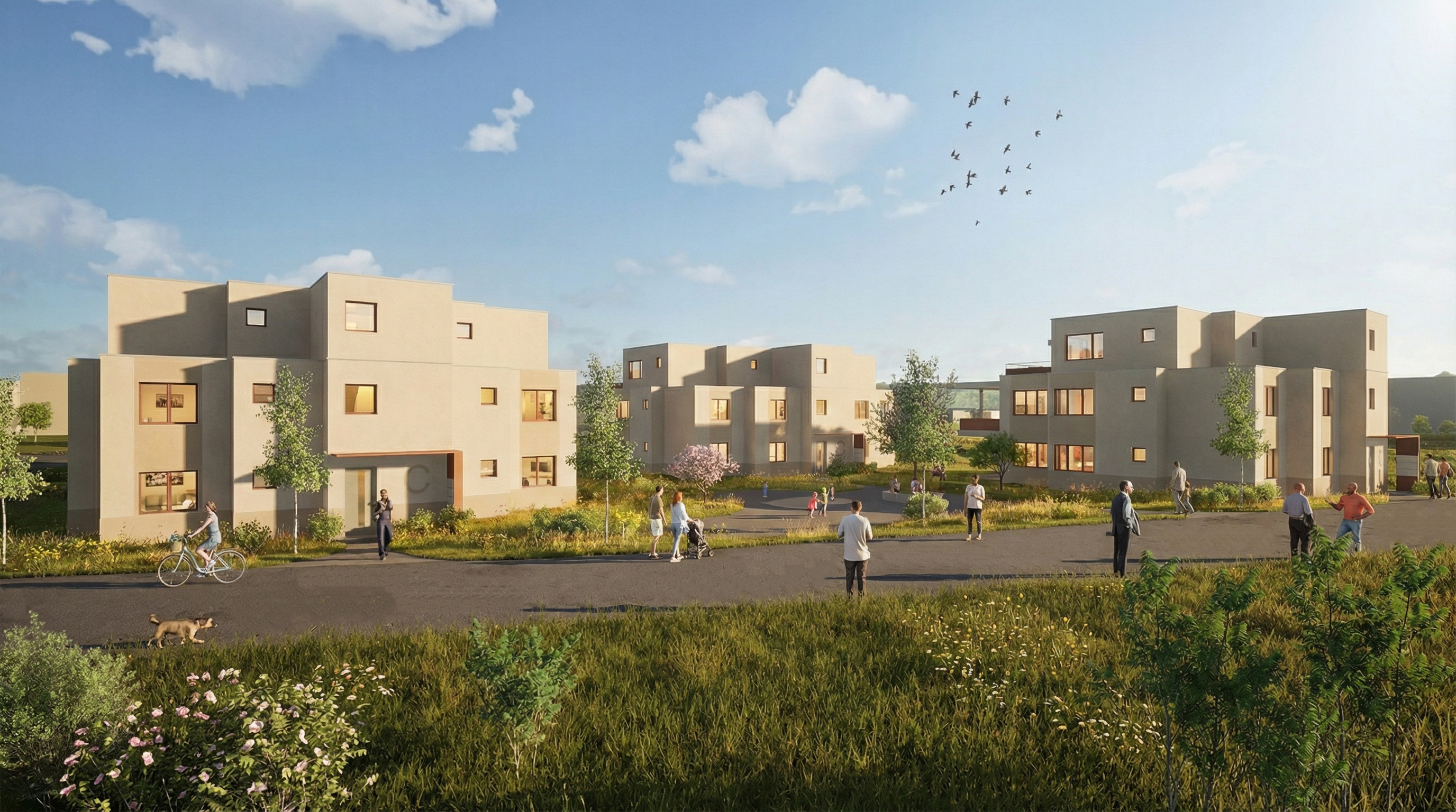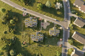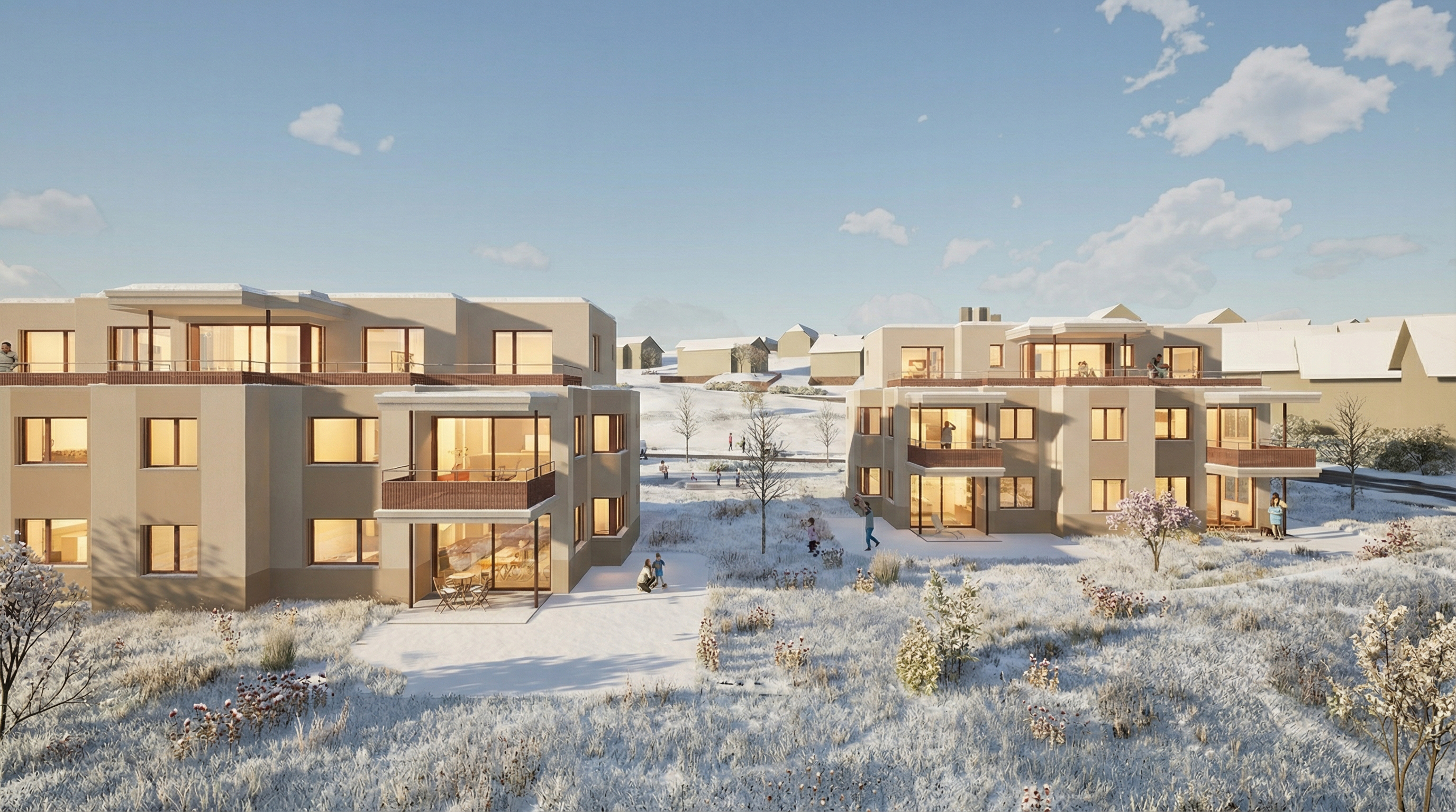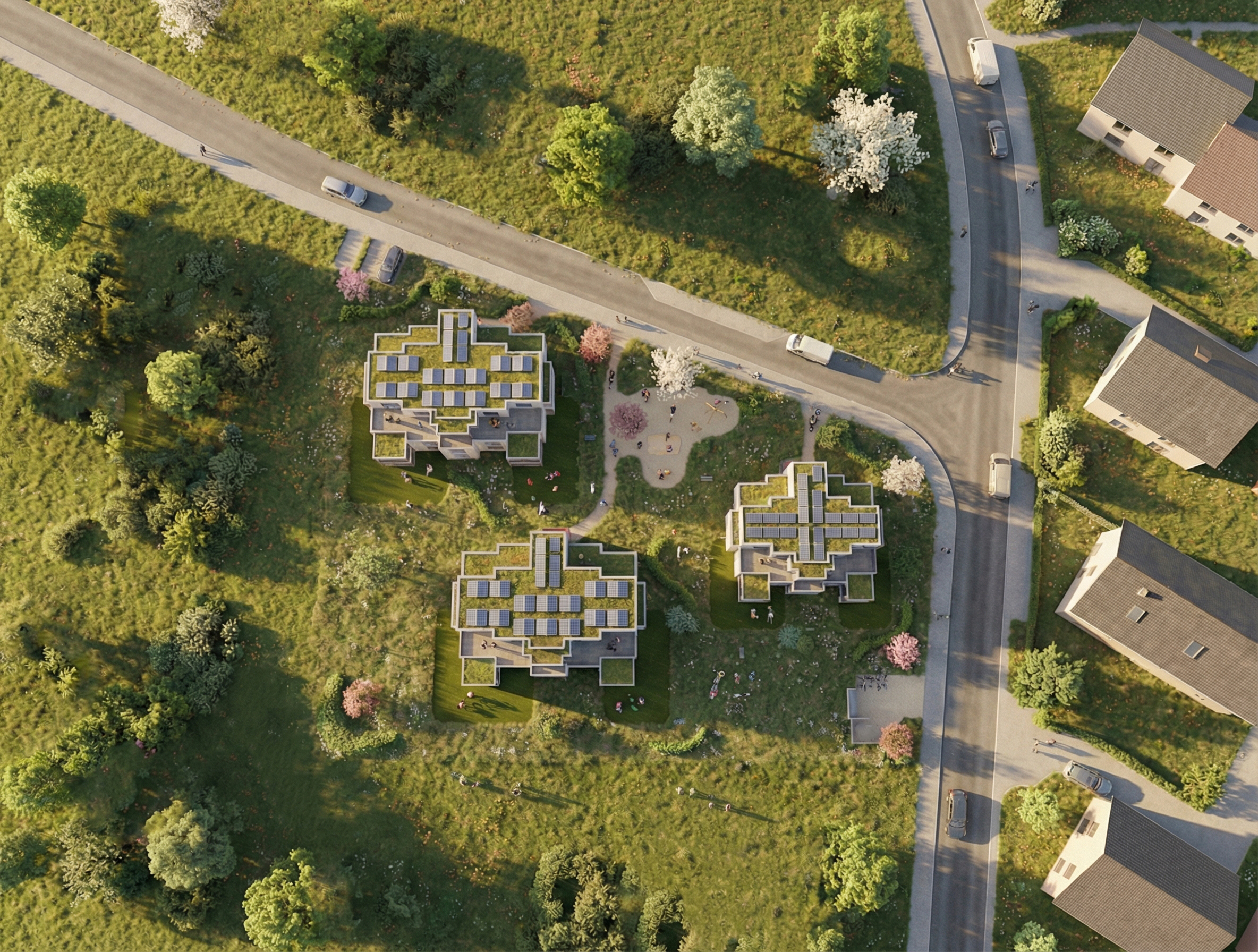 Die drei Mehrfamilienhäuser sind als eigenständige Baukörper mit jeweils individuellem Gebäude-Fussabdruck konzipiert. Durch diese differenzierte Setzung entstehen abwechslungsreiche Zwischenräume und klare Bezüge zur Umgebung. Die Anordnung der Gebäude fördert eine gute Belichtung aller Wohnungen und ermöglicht attraktive Blickbeziehungen innerhalb der Anlage sowie in den Außenraum.