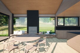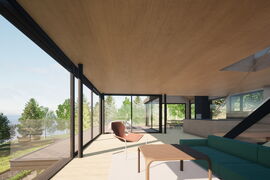 Die großzügigen Fenster im Wohnbereich lassen die umgebende Natur nahtlos in den Innenraum übergehen. Filigrane Innenstützen übernehmen den vertikalen Lastabtrag und gewährleisten die erforderliche Sicherheit.