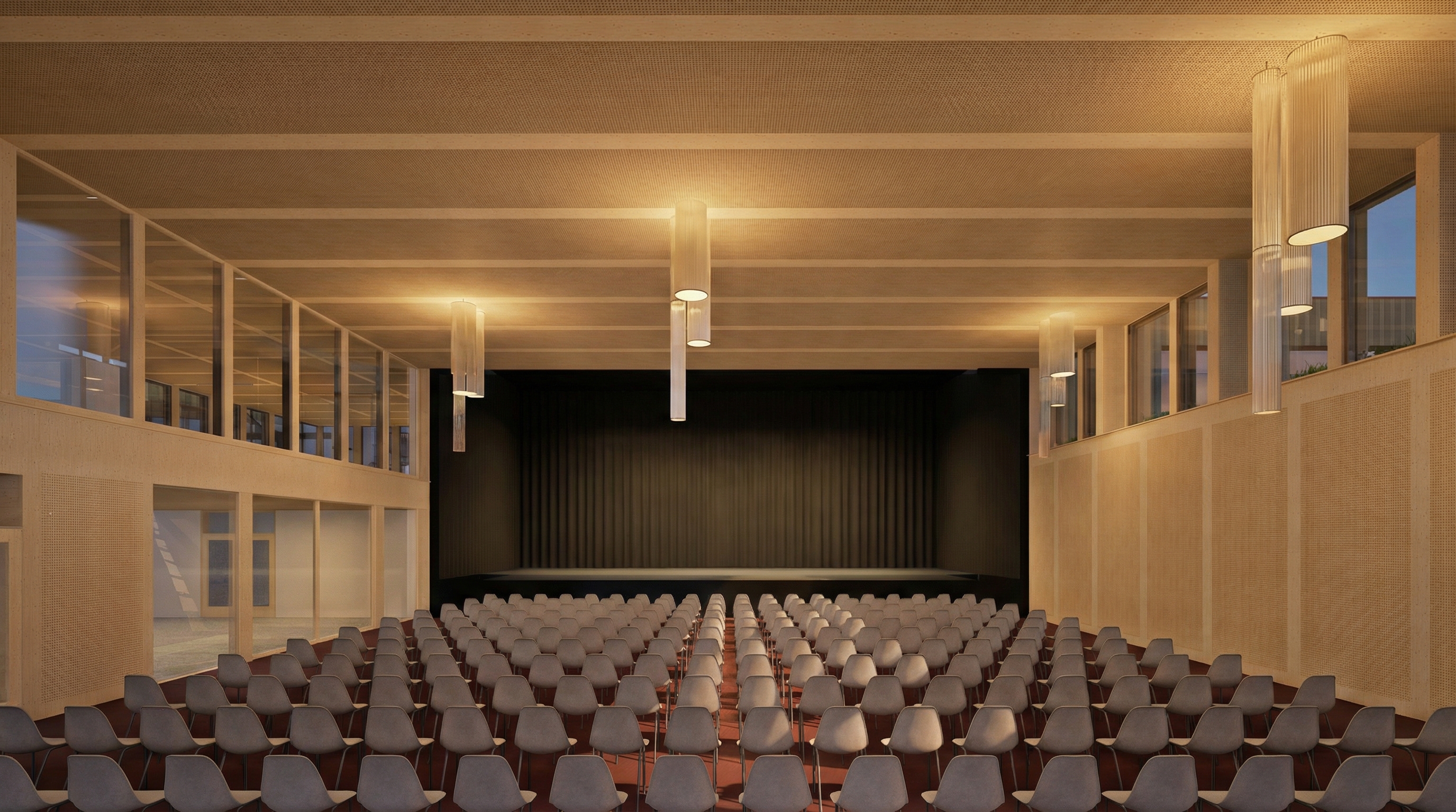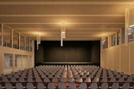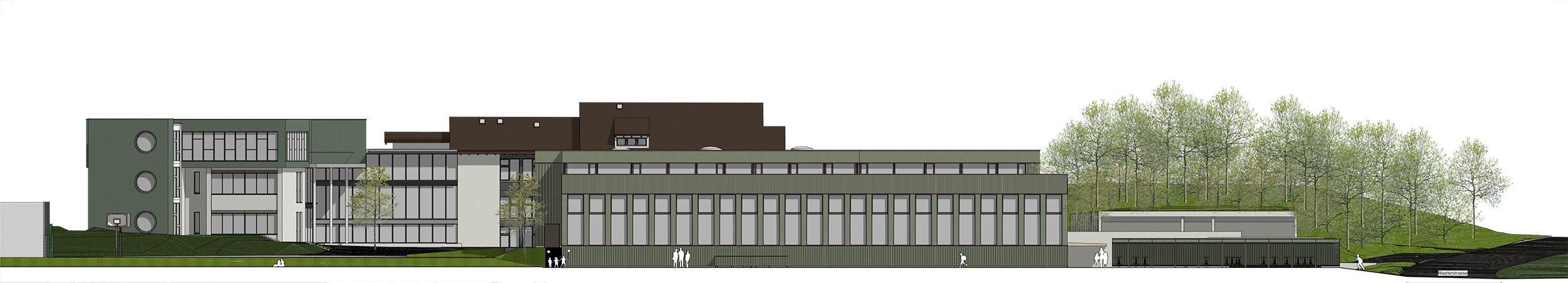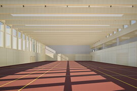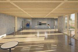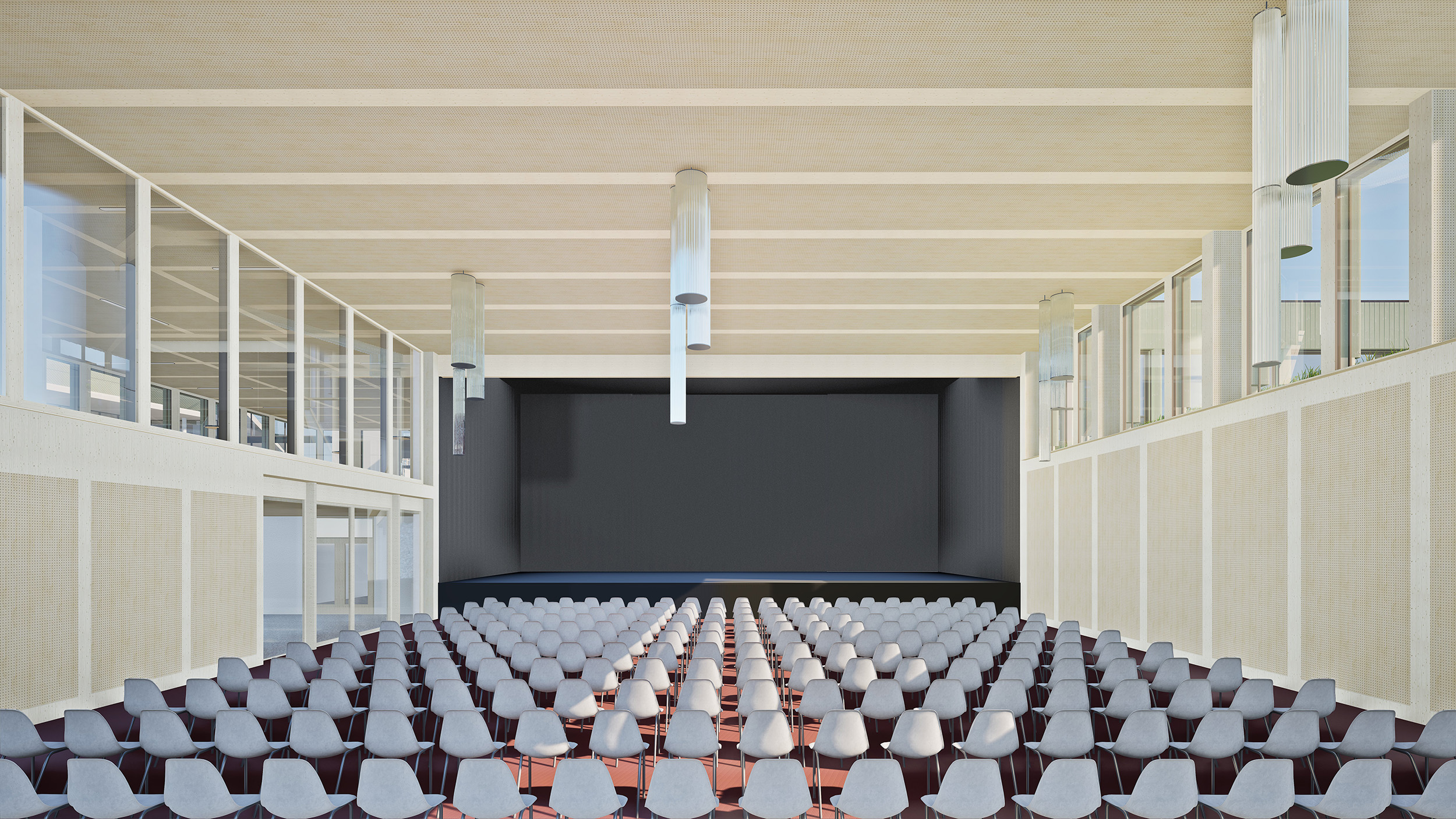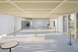 Nach Fertigstellung der Halle wird das bestehende Mehrzweckgebäude zurückgebaut und durch einen Neubau ersetzt. Das neue MZG fügt sich nahtlos an die Sporthalle an und bildet zusammen mit den bestehenden Trakten einen stimmigen Gesamtkomplex. Es bietet eine helle Eingangshalle, ein flexibel nutzbares Foyer, eine grosszügige Küche sowie einen vielseitigen Mehrzwecksaal mit Bühne. Dank durchdachter Logistik können gleichzeitig Veranstaltungen und Sportbetrieb stattfinden.