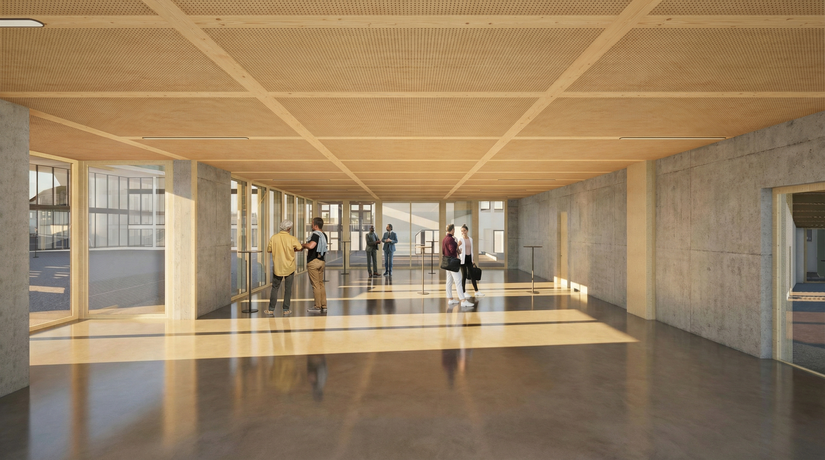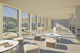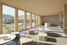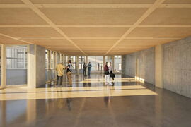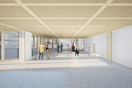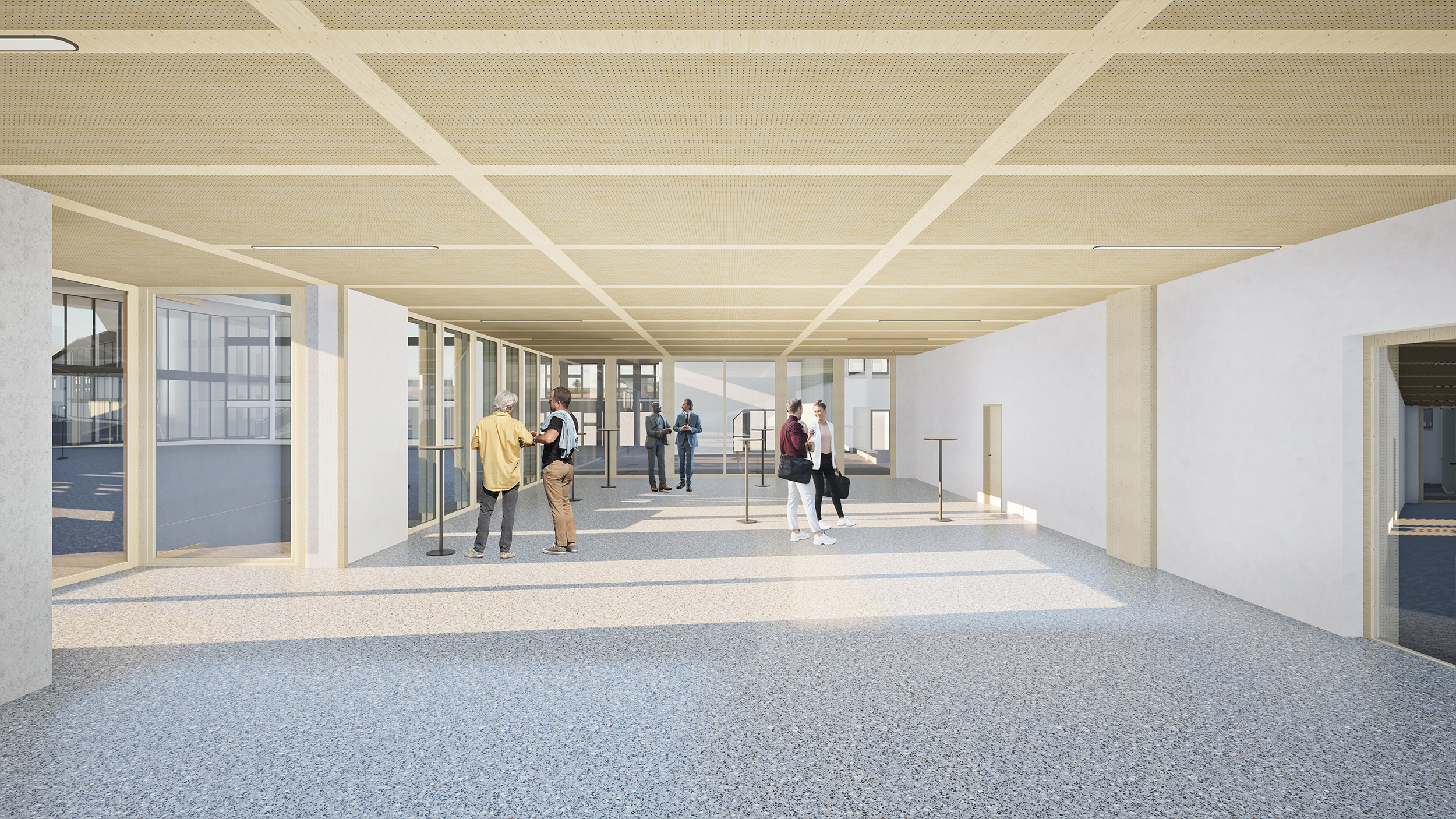 Die Architektur setzt auf eine ehrliche Materialität aus Sichtbeton und Holz, ergänzt durch grosse Glasflächen. Auch die Umgebung wird neu gestaltet: zusätzliche Veloabstellplätze, ein aufgewerteter Innenhof und klar strukturierte Freiräume fördern die Aufenthaltsqualität.