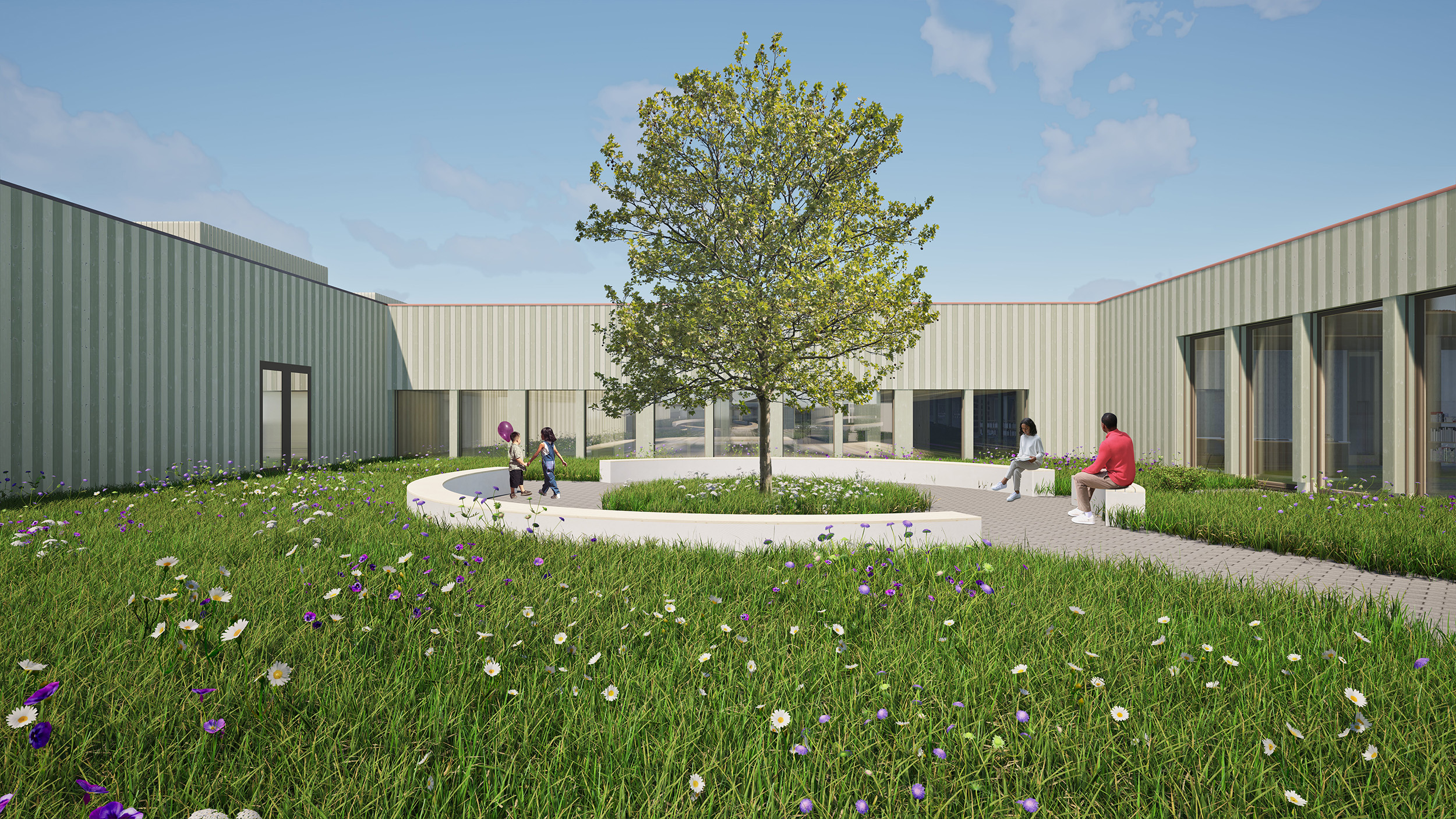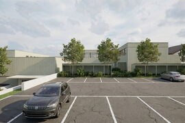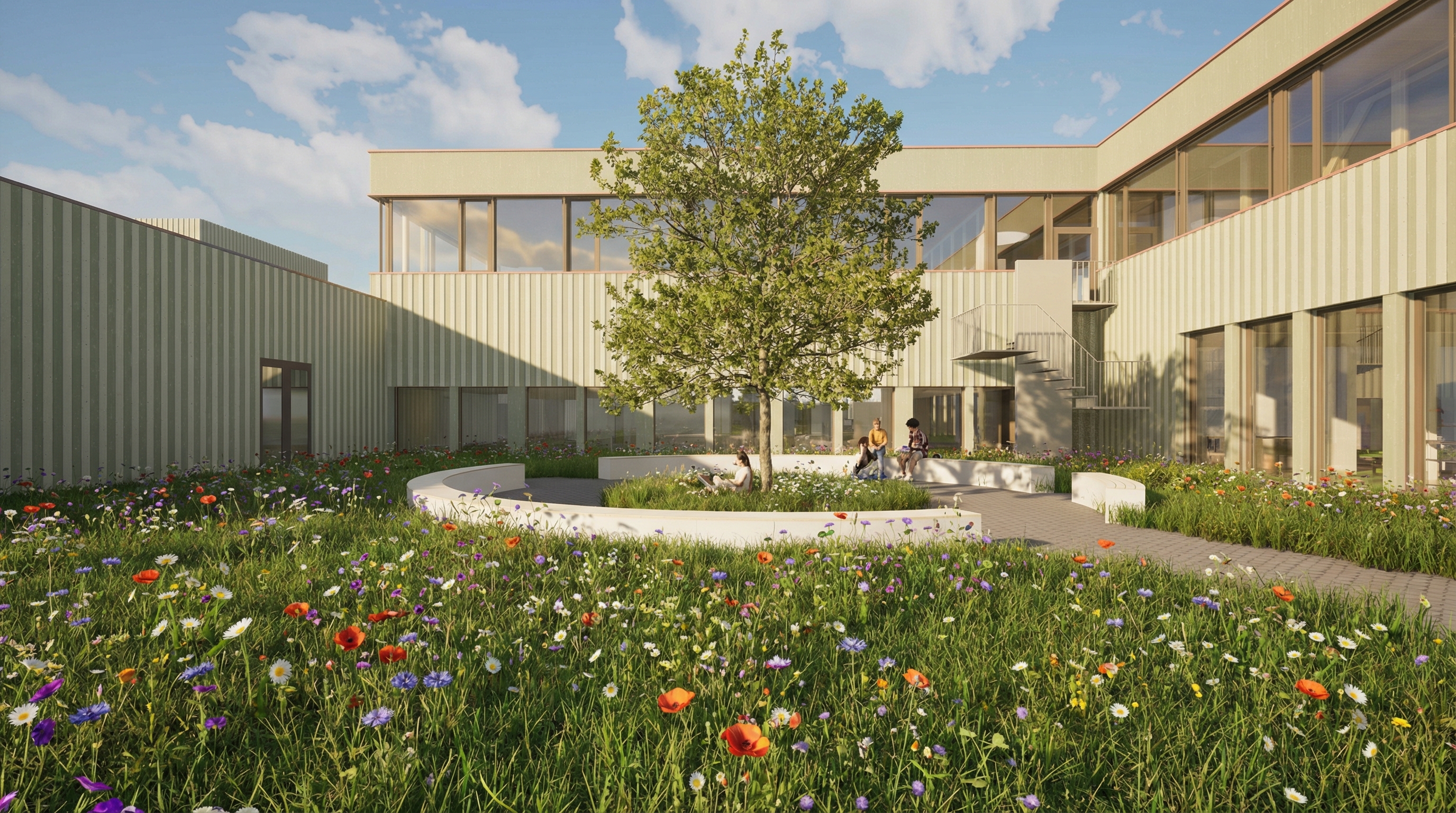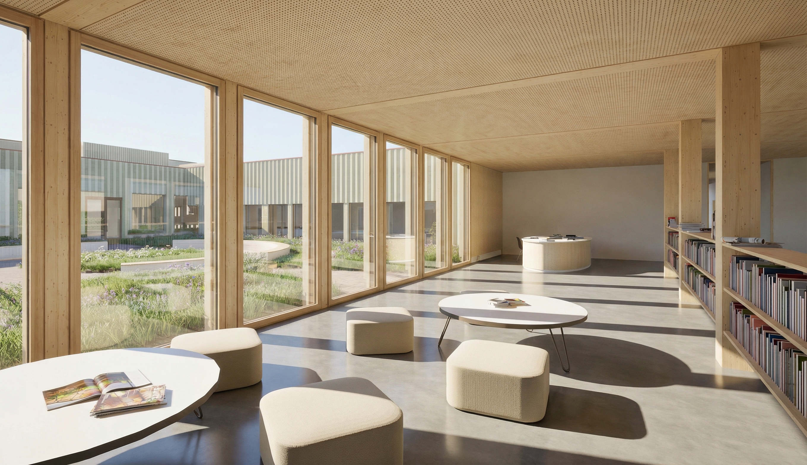 Die Architektur setzt auf eine ehrliche Materialität aus Sichtbeton und Holz, ergänzt durch grosse Glasflächen. Auch die Umgebung wird neu gestaltet: zusätzliche Veloabstellplätze, ein aufgewerteter Innenhof und klar strukturierte Freiräume fördern die Aufenthaltsqualität.