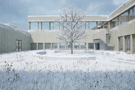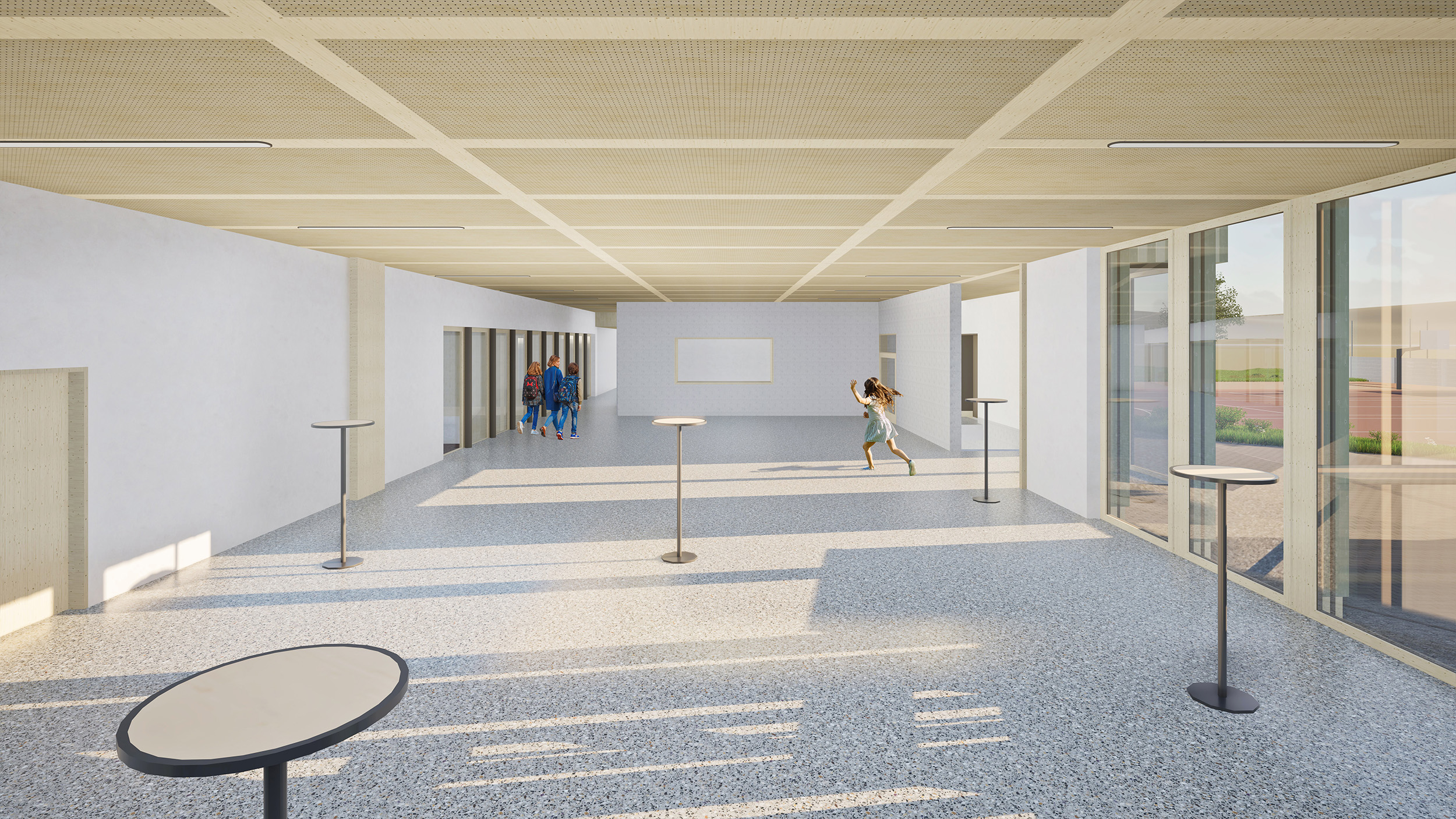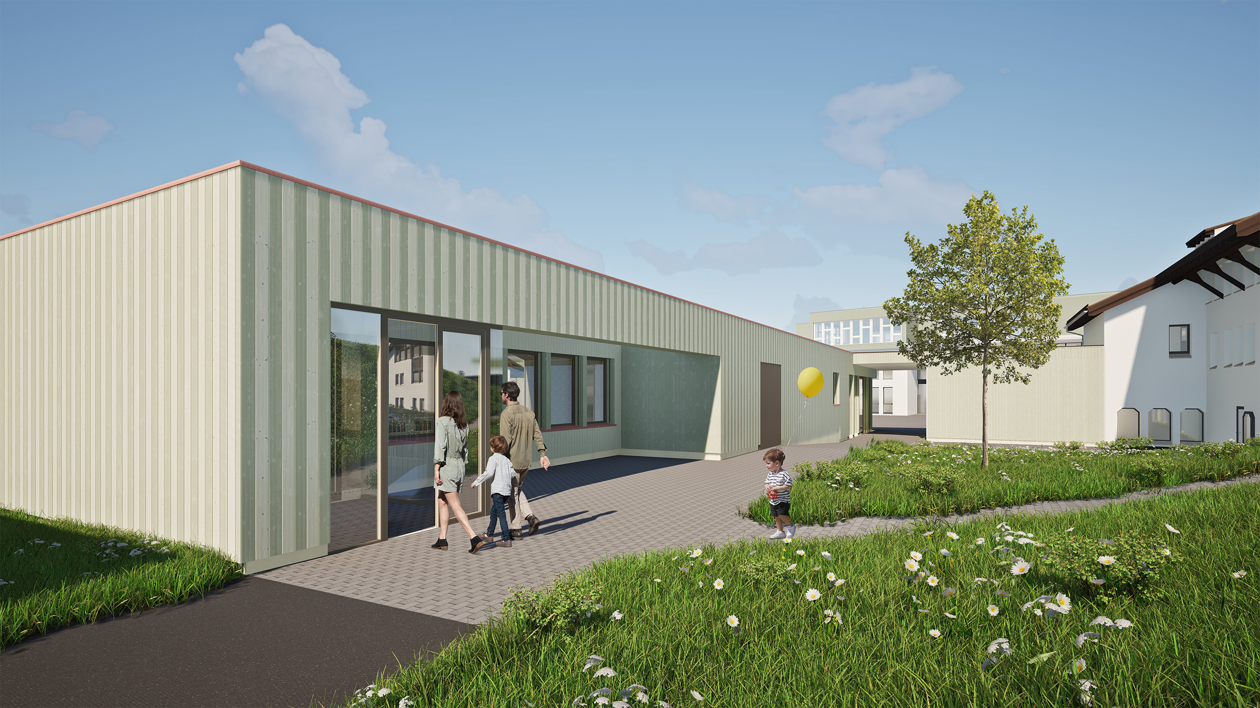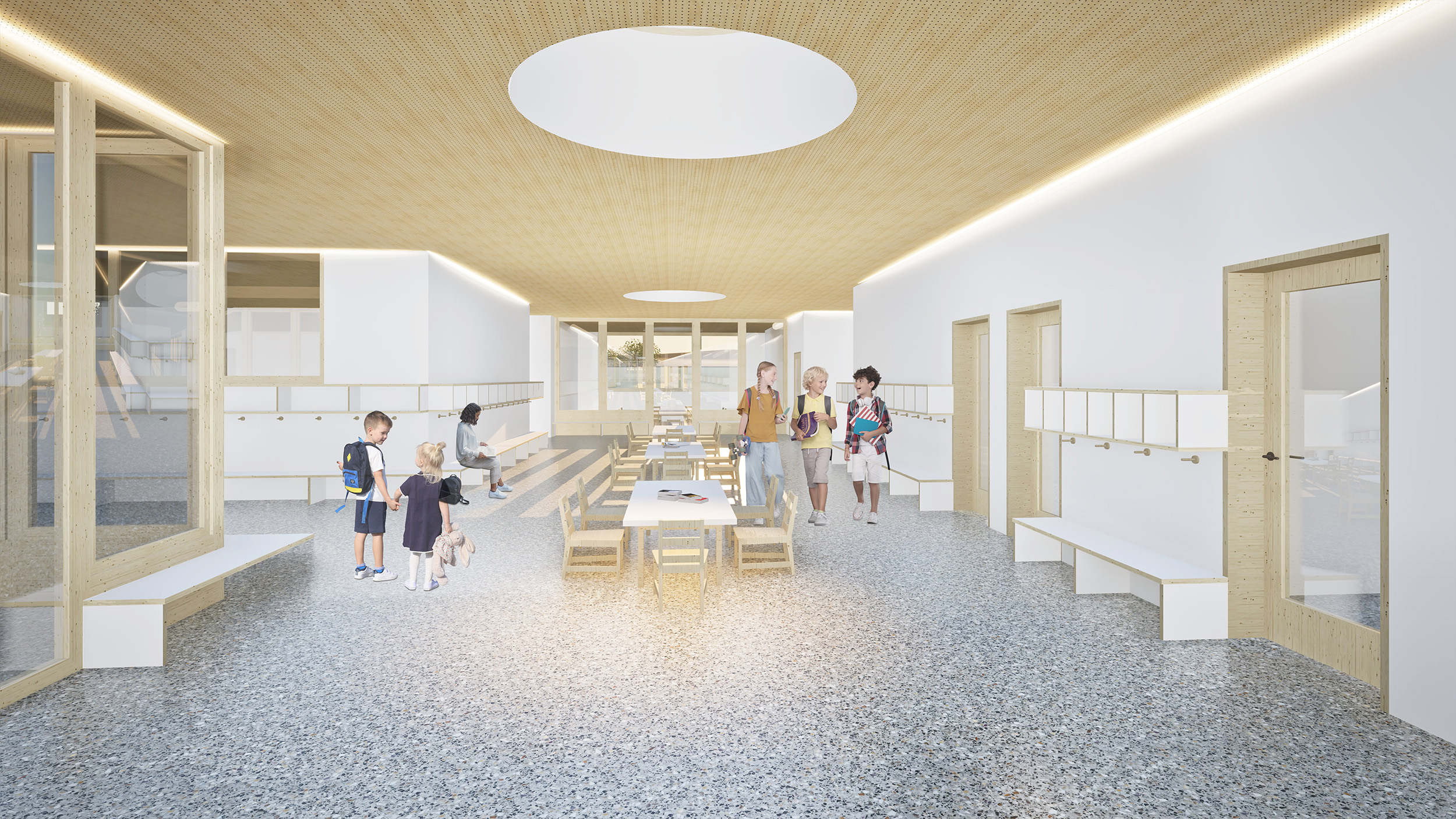 Um zukünftigen Bedarf abzudecken, ist eine optionale Aufstockung des neuen MZG vorgesehen. Dort könnten zusätzliche Schulzimmer, Gruppenräume und ein Lehrerzimmer entstehen. Viel Tageslicht, flexible Aufenthaltszonen und eine leichte Holzbauweise sorgen für ein freundliches Lernumfeld, das sich respektvoll in die bestehende Massstäblichkeit einfügt.