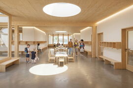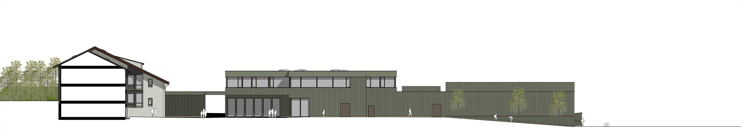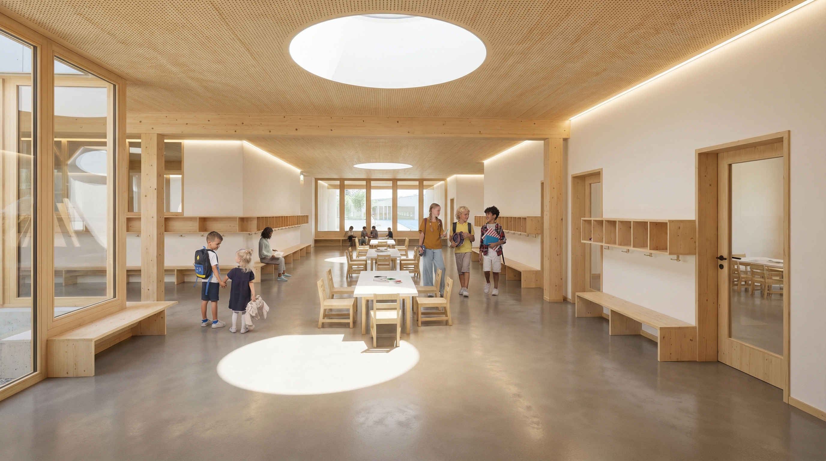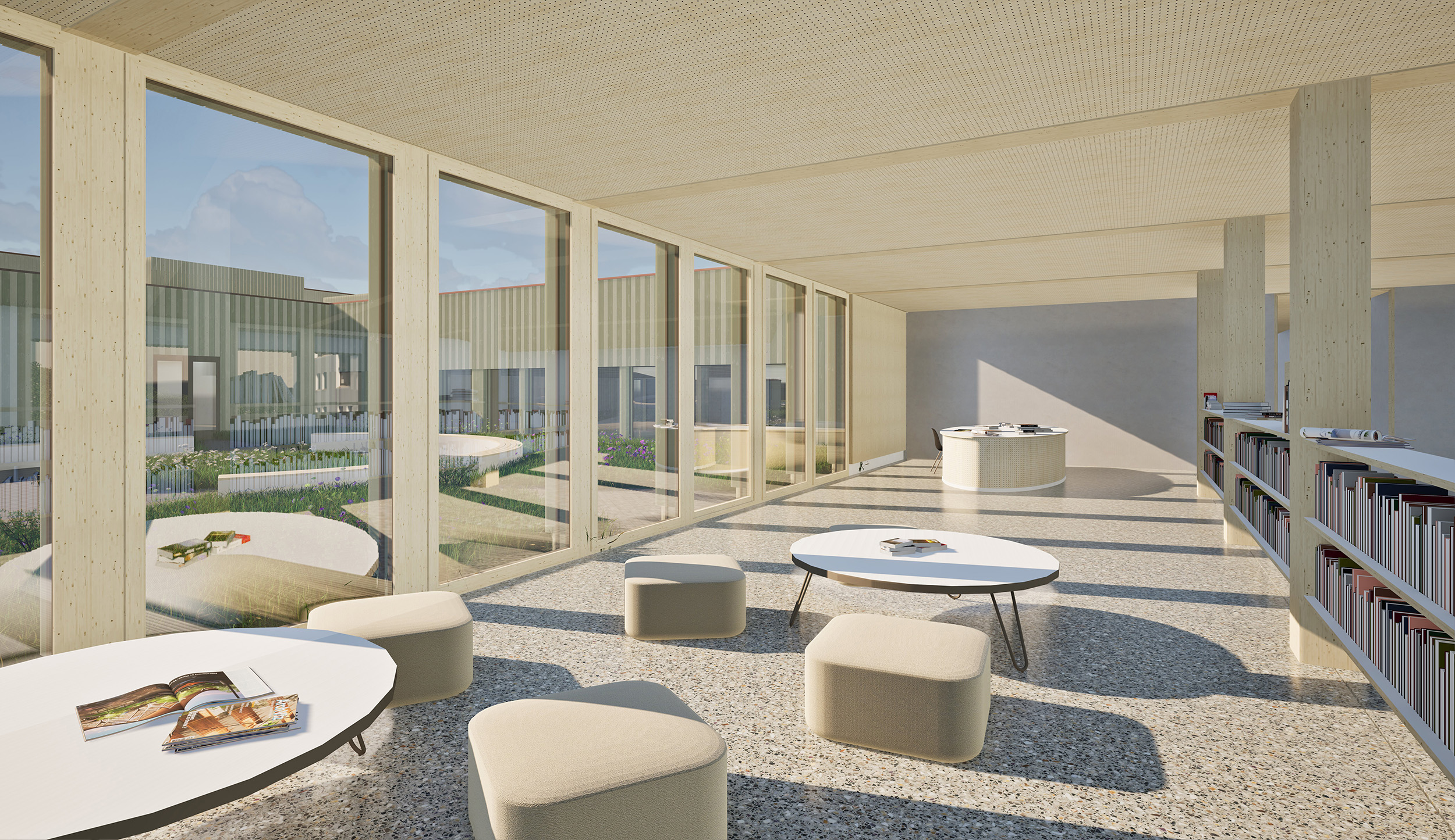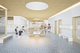 Um zukünftigen Bedarf abzudecken, ist eine optionale Aufstockung des neuen MZG vorgesehen. Dort könnten zusätzliche Schulzimmer, Gruppenräume und ein Lehrerzimmer entstehen. Viel Tageslicht, flexible Aufenthaltszonen und eine leichte Holzbauweise sorgen für ein freundliches Lernumfeld, das sich respektvoll in die bestehende Massstäblichkeit einfügt.