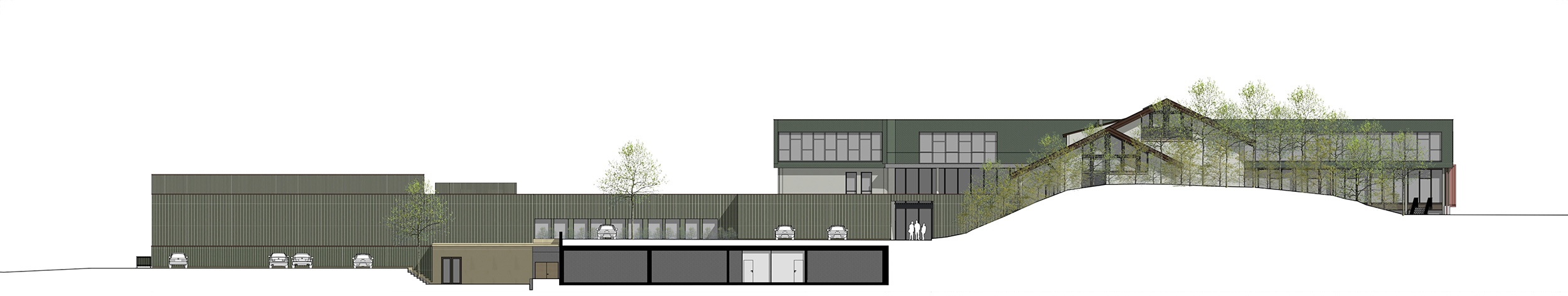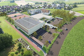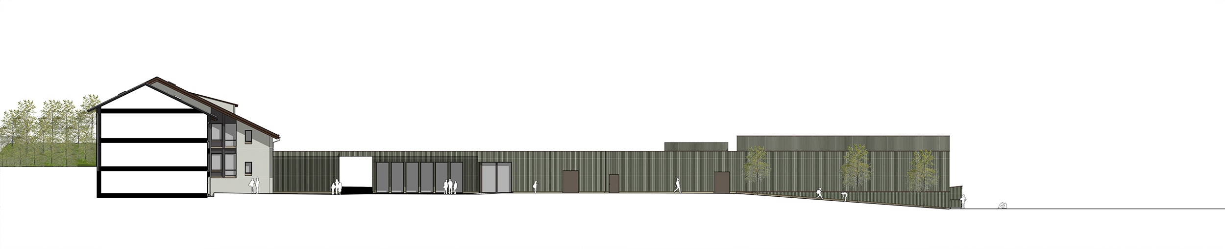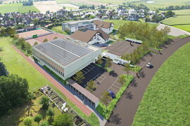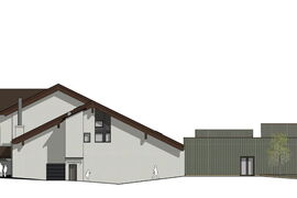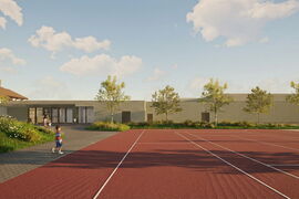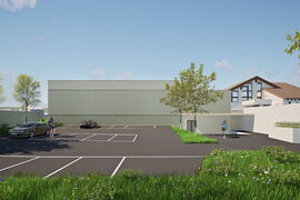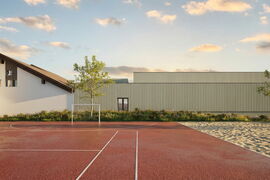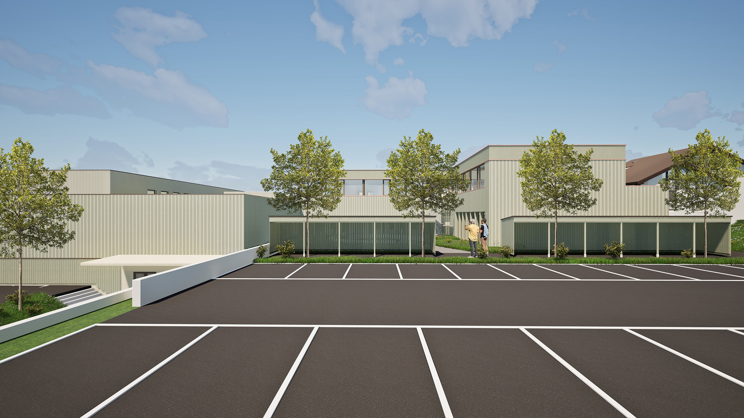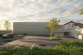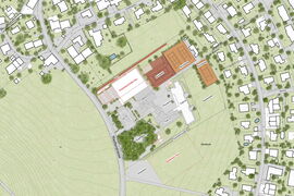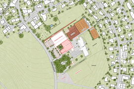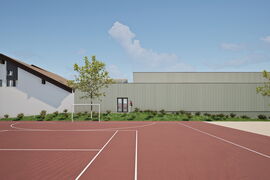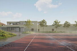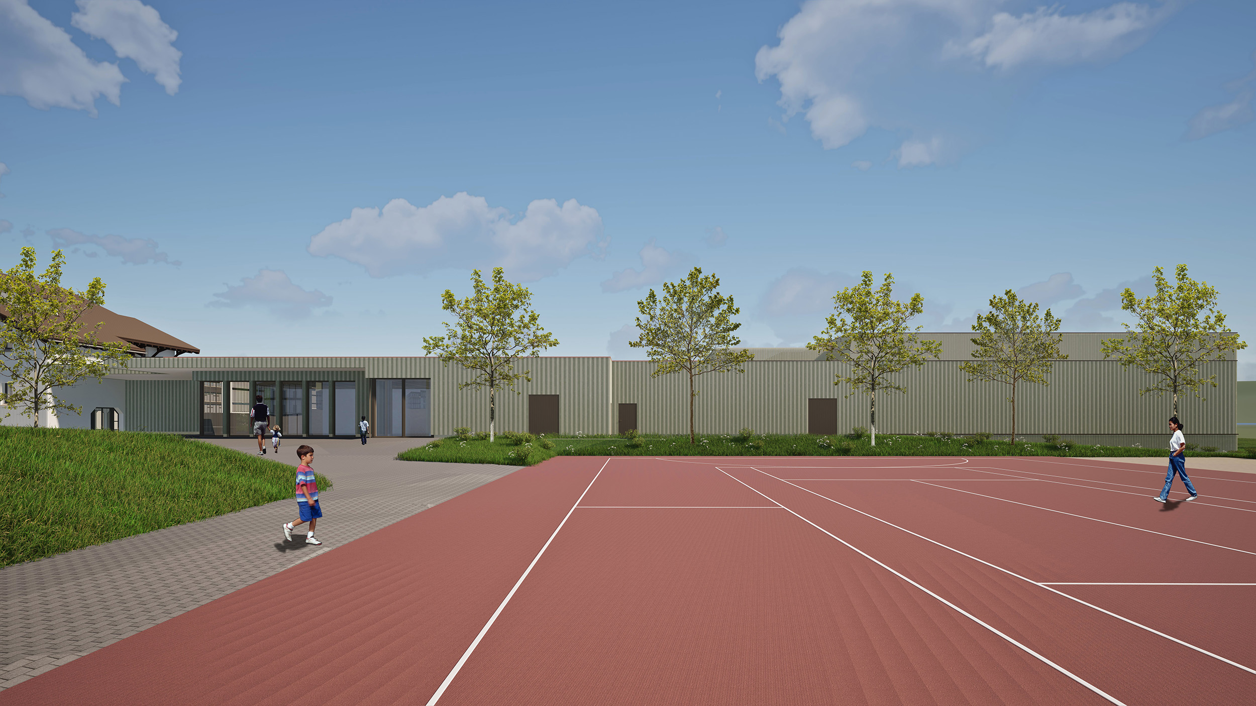 Das bestehende Schulareal wird durch eine neue, kompakte Doppelsporthalle erweitert. Sie fügt sich trotz ihrer Grösse harmonisch ins Dorf ein und stärkt die bestehende Struktur. Der Neubau wird sorgfältig in die Umgebung integriert: Der Parkplatz wird neu organisiert, ein attraktiver Vorplatz mit Begrünung entsteht, und sichere Wege für Kinder zu Fuss und mit dem Velo werden geschaffen. Eine neue Spielwiese auf der Südostseite ersetzt die bisherige, wobei das Aushubmaterial der Halle clever wiederverwendet wird. Während der gesamten Bauzeit bleibt der Schulbetrieb ohne Einschränkungen bestehen.