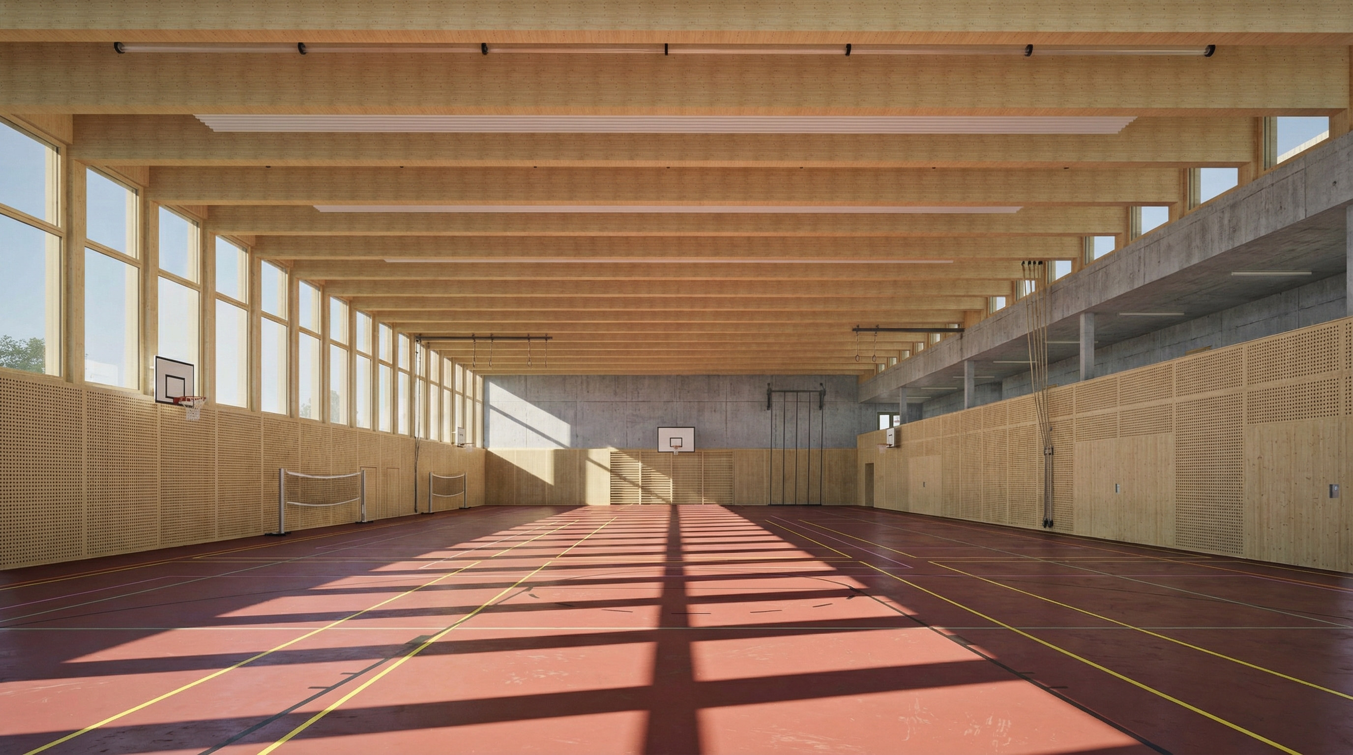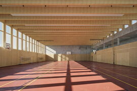 Die Halle selbst überzeugt mit einer klaren Struktur: einer grosszügigen, teilbaren Spielfläche, einer Galerie mit Zuschauerbereich, modernen Garderoben und Nebenräumen sowie viel Tageslicht. Konstruktiv kombiniert sie Beton im Sockelbereich mit nachhaltigem Holzbau und einer Fassade aus druckimprägniertem Holz, die sich harmonisch ins Umfeld einfügt.